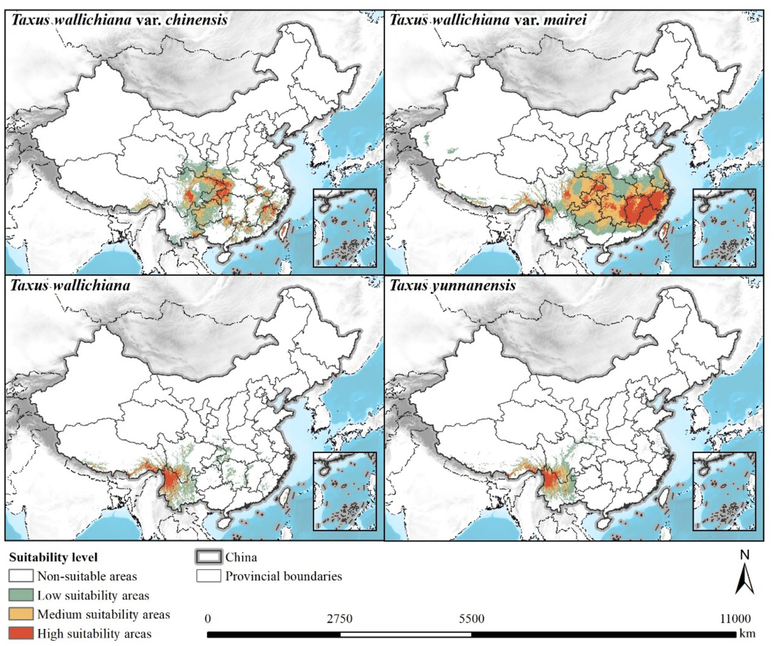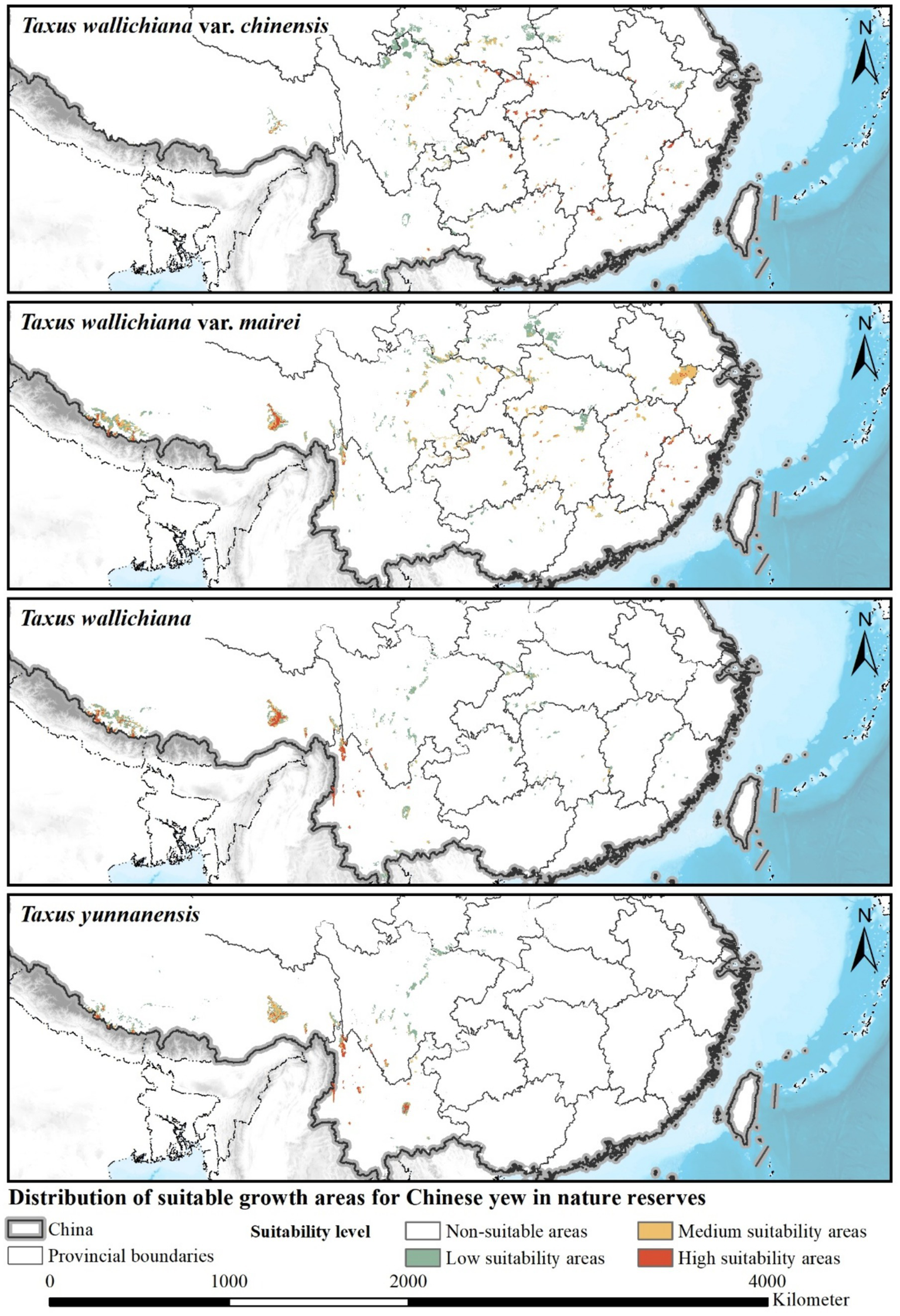 In southern China, four species of the Taxus genus are distributed, and identifying their suitable habitats plays an important role in species conservation.