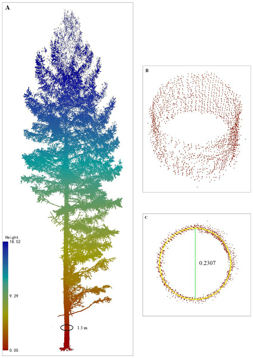 Single tree points cloud and diameter extraction (taking 1.3 m as an example). (A) A larch colored by height (DBH = 23.07 cm, TH = 18.52 m); (B) point cloud at the 1.3 m position with a layer thickness of 1.2–1.4 m and buffer of 20 cm; (C) rasterized point cloud at 1.3 m with a fitted diameter of 0.2307 m.