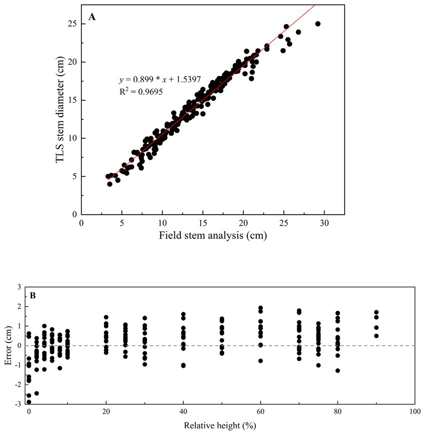 One-to-one plot showing the diameters captured via TLS via stem analysis (A) and the errors at each relative height (B).