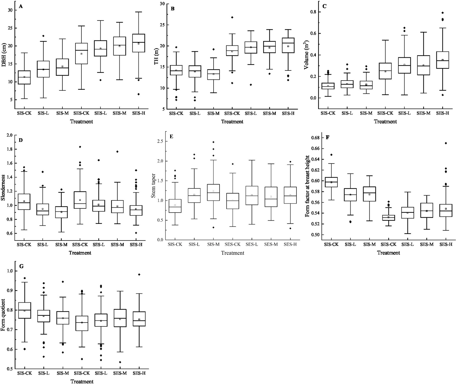 DBH is the diameter at breast height; TH is the total tree height; Min is the minimum; Max is the maximum; and SD is the standard deviation. SIS = stand initiation stage; SES = stem exclusion stage; CK = control check; L = light thinning; M = moderate thinning; H = heavy thinning.