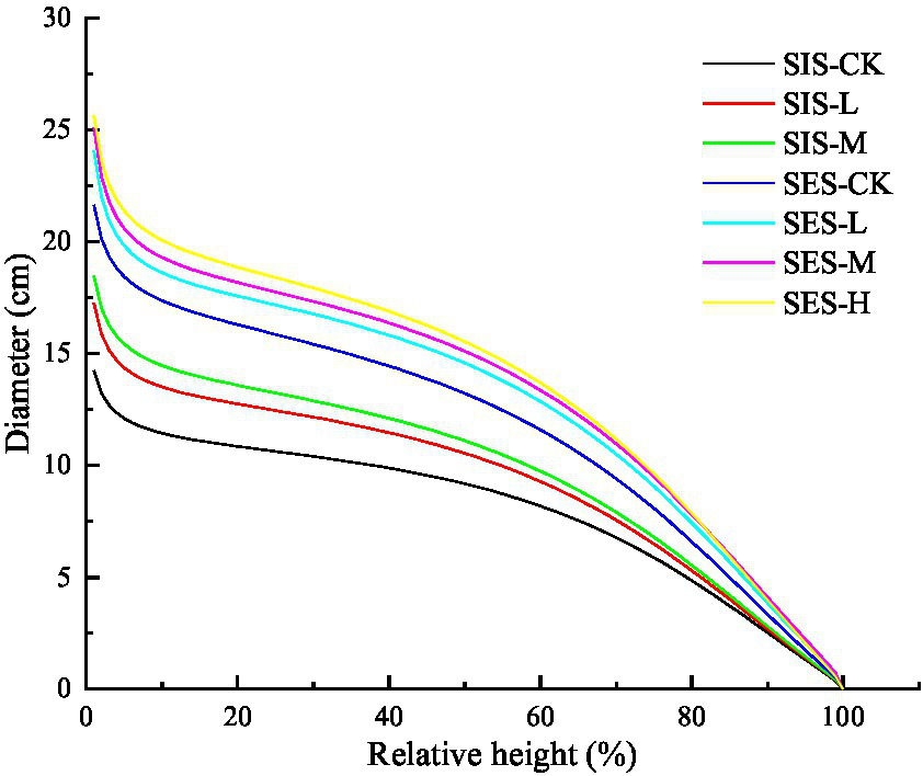 In this study, four highly accurate taper equations were used to simulate the stem shape of larch at each thinning intensity in the stand initiation and stem exclusion stages: Max and Burkhart (1976) [abbreviated as Max and Burkhart (1976)], Fang et al. (2000), Bi (2000) and Kozak (2004). Max and Burkhart (1976) and Fang et al. (2000) are segmented models, Bi (2000) is a trigonometric variable form, and Kozak (2004) is a variable-exponent taper equation. The basic model form is shown in Table 3.