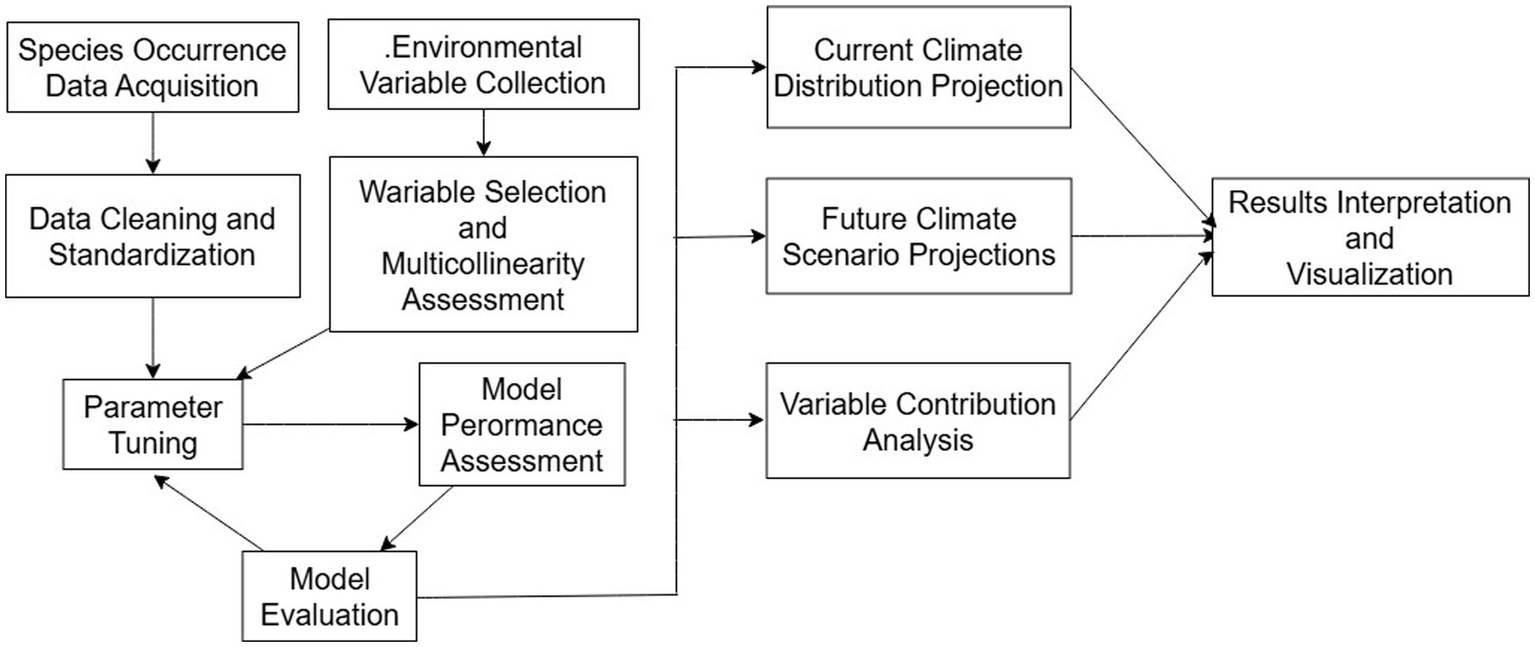 This study centered on the Qinghai-Tibetan Plateau (QTP), an expansive elevated region in Central and East Asia. This unique geographical feature exerts significant influence on regional and global climate patterns, making it a critical area for ecological research in the context of climate change. The phased uplift of the Tibetan Plateau has been the key driver in the Cenozoic Asian monsoon system’s development. By modifying regional topography and thermal dynamics, it has incrementally shaped unique monsoon circulation and precipitation patterns (Zhisheng et al., 2001). Our research focused on Tibetan juniper, an endemic tree species of particular ecological importance on the QTP. S. tibetica is a slow-growing coniferous tree adapted to the harsh high-altitude environment, typically found at elevations between 2,800 to 4,600 m. It often forms the treeline in many parts of the plateau and plays a crucial role in the region’s ecosystem functioning. In this study, we carefully selected a suite of environmental variables to explore the distribution patterns of Tibetan juniper. These variables encompassed climatic, edaphic, and topographic factors, which are thought to potentially influence plant distributions. Through this comprehensive approach, we aimed to elucidate the complex factors that may shape the distribution of this distinctive species.