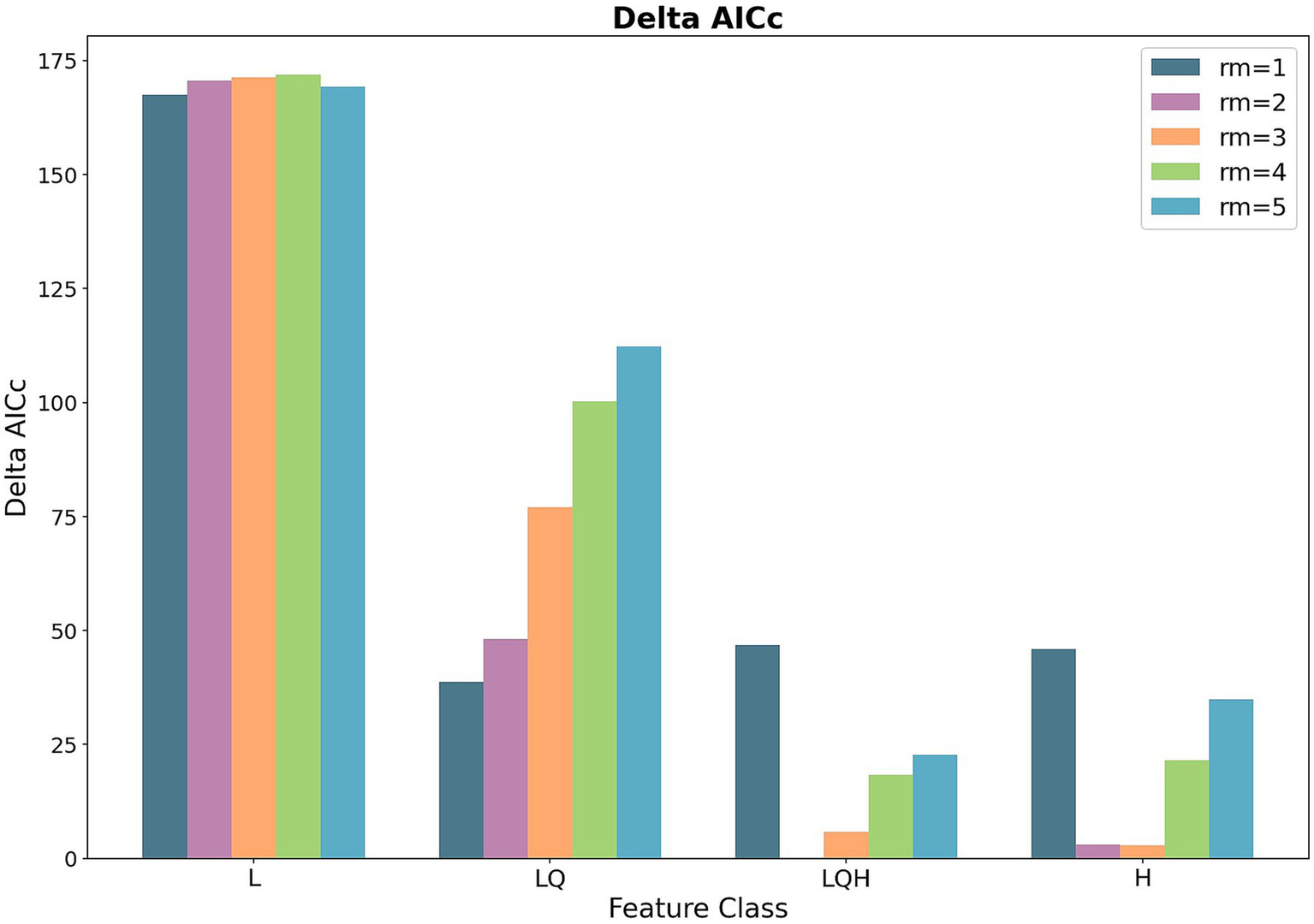 We evaluated the performance of various MaxEnt model (Zurell et al., 2020) configurations by systematically assessing different feature class combinations (L: linear, Q: quadratic, H: hinge) and regularization multiplier (rm) values ranging from 1 to 5. This analysis was conducted using the ENMeval package in R (Muscarella et al., 2014). Model selection was based on the corrected Akaike Information Criterion (AICc), which balances model fit and complexity (Warren and Seifert, 2011). Delta AICc values were calculated for each model configuration, with lower values indicating superior performance. Our results (Figure 2) demonstrated that more complex feature combinations (LQH) generally yielded lower Delta AICc values compared to simpler models (L or LQ). The impact of increasing rm. values varied across feature classes, initially improving model fit but potentially leading to overfitting at higher values. The optimal model configuration was determined by the lowest Delta AICc value, ensuring a balance between model fit and parsimony (Phillips and Dudík, 2008; Elith et al., 2011).