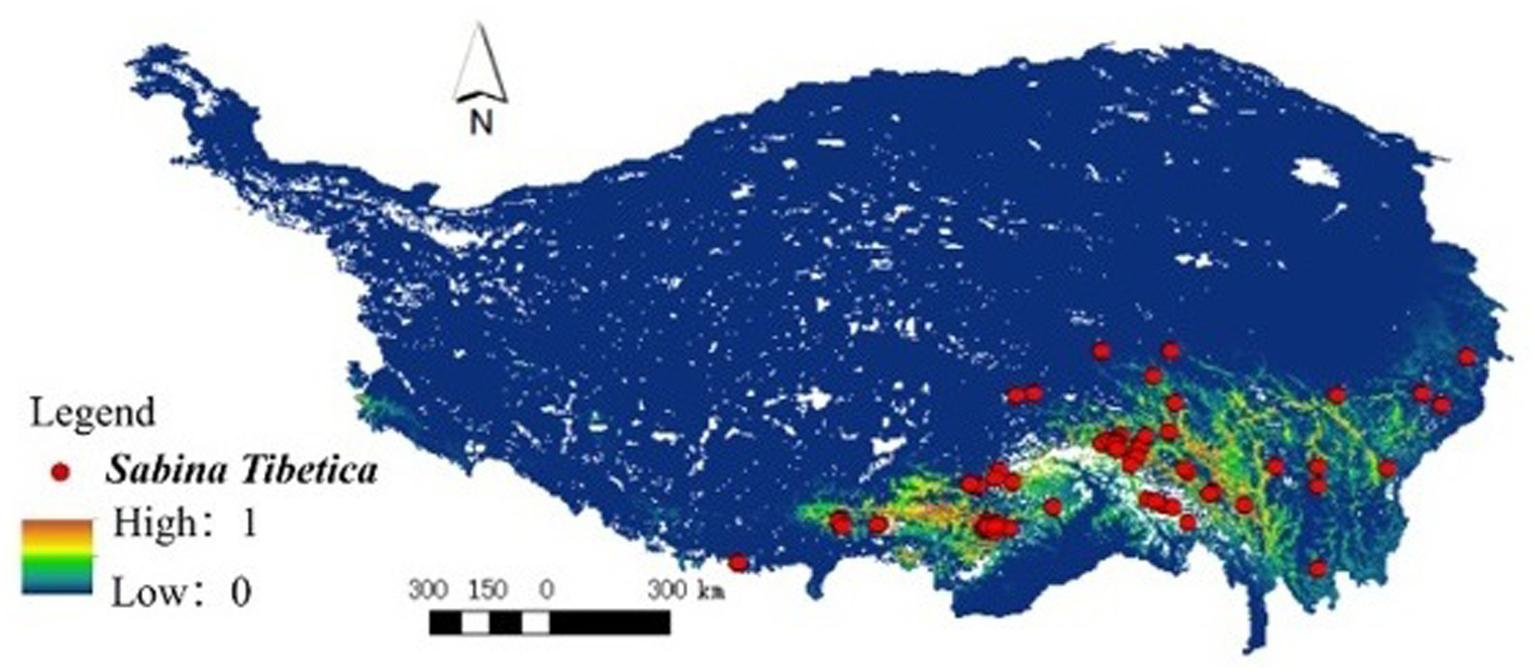 The MaxEnt model showed a significantly large habitat suitable for Tibetan juniper, which is much larger than the currently known species distribution. The majority of the observed distribution points for current Sabina tibetica align with the highly suitable distribution area projected by the model. However, a few actual distribution points are situated within the low suitable distribution area as predicted by the model. This is probably because the model cannot include factors such as niche competition. What’s more, there aren’t distribution points of Sabina tibetica in the highly suitable distribution areas predicted by many models. Due to the complex topography of the Qinghai-Tibet Plateau, there are relatively few survey records in remote areas of the distribution of juniper. In the future, more data from field surveys to these areas will improve the accuracy of the MaxEnt model as well as its predictions.