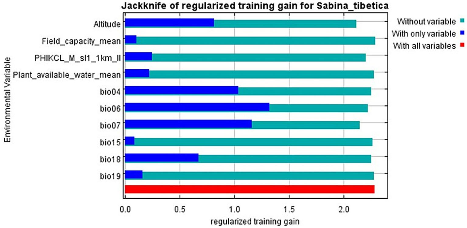 Jackknife test to verify the correlation of environmental variables of Sabina tibetica in the Tibetan Plateau.