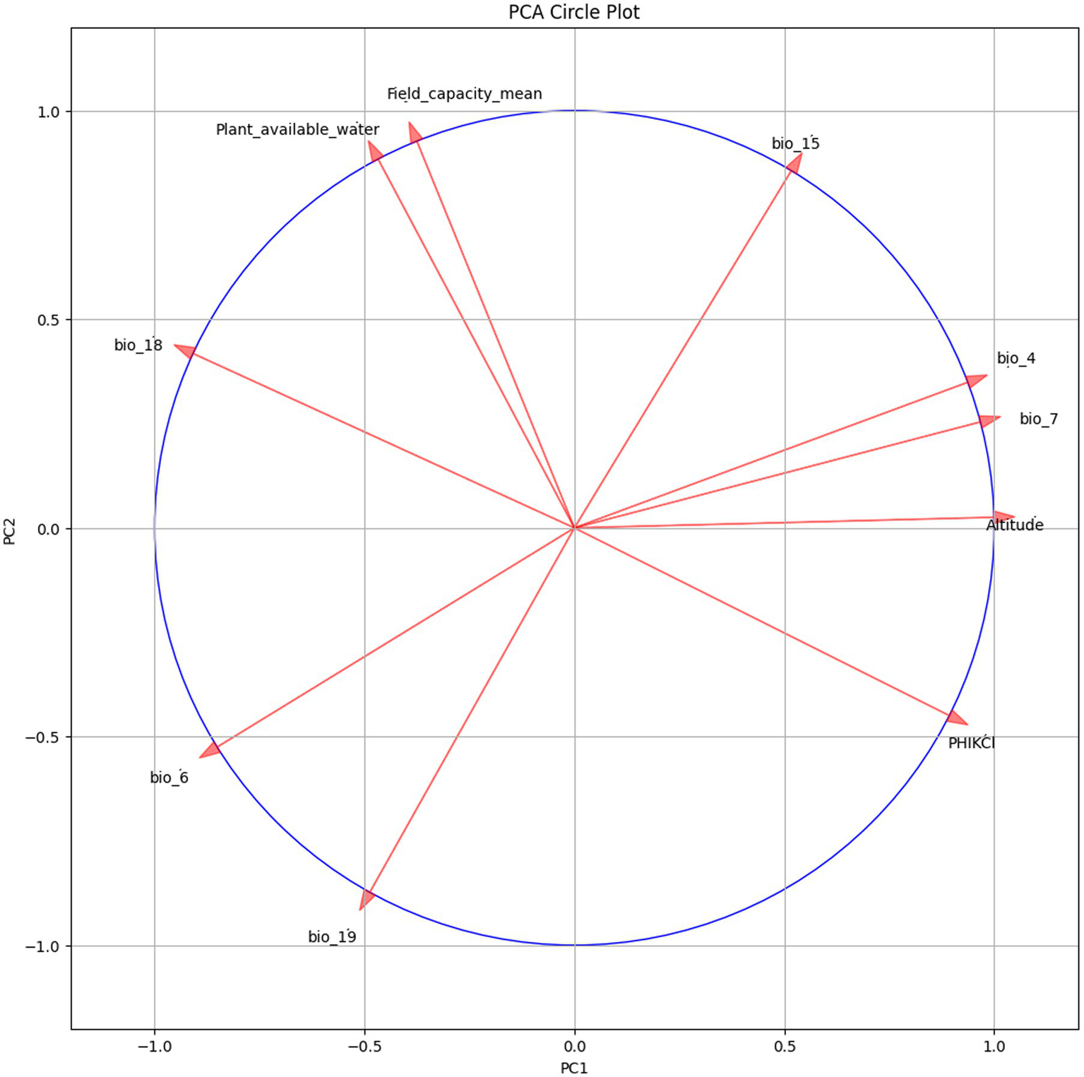 Among the 23 environmental variables used to generate the MaxEnt model, 10 variables eventually entered the model after dimensionality reduction and Jackknife test (Figure 4). Five environmental variables, which had the most significant contributions when used separately, accounted for 86.5% of variance in Tibetan juniper distribution. These five variables were Min Temperature of Coldest Month (accounted for 35.1% of the variance), Temperature Annual Range (accounted for 11.2% of the variance), Temperature Seasonality (accounted for 6.1% of the variance), Altitude (accounted for 11.3% of the variance) and Precipitation of Warmest Quarter (accounted for 18.9% of the variance). The other five variables, namely Temperature Seasonality, Plant available water, Precipitation Seasonality, Precipitation of Coldest Quarter and Field capacity, have less impact on the distribution of Tibetan juniper. At the same time, in order to verify that there is no collinearity between the optimal explanatory variables, we assessed their contribution to the principal axis load through PCA-env analysis and determined the percentage of inertia explained by each axis. The findings revealed that these 10 environmental variables exhibited a relatively weak correlation with each other (Figure 5).