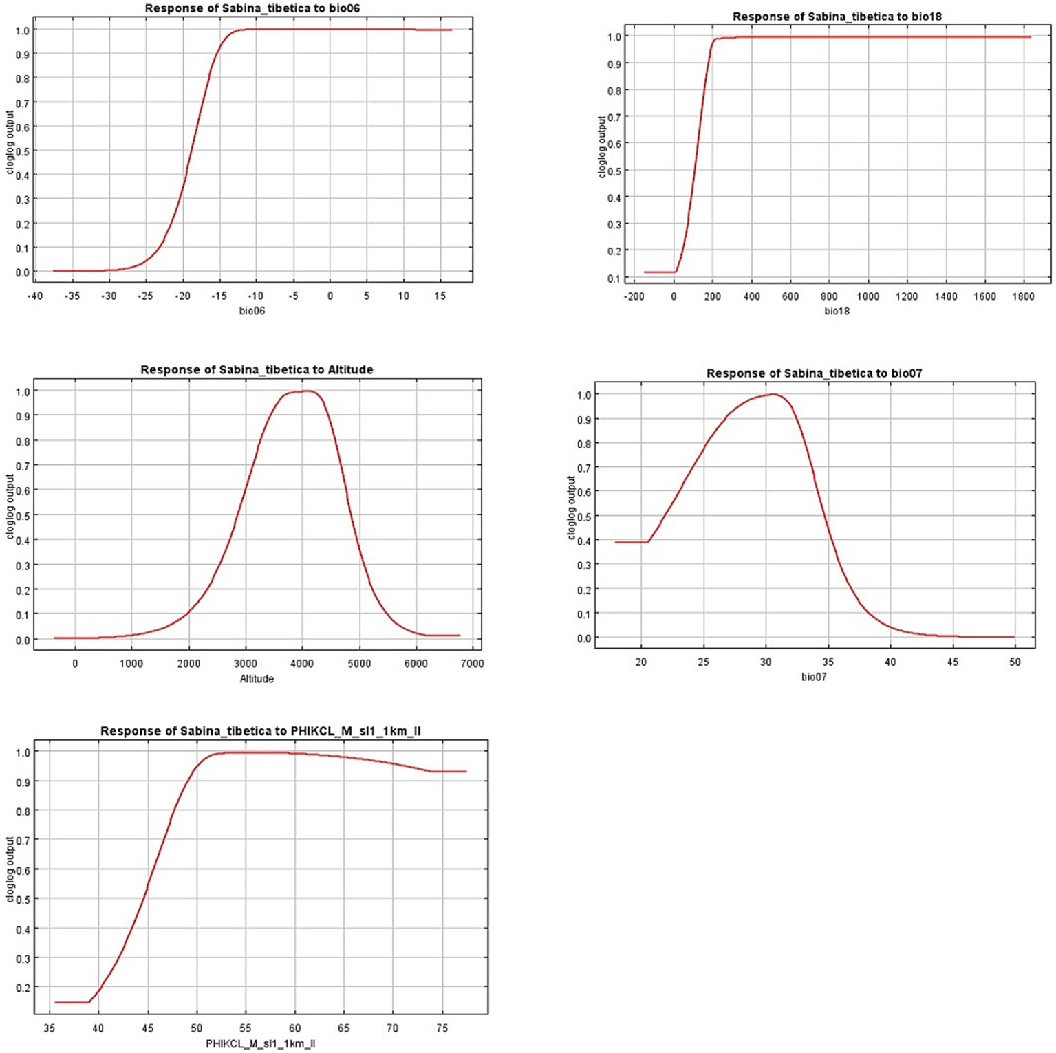 From the response curve, we can obtain the thresholds of main environmental variables (probability of existence > 0.5) limiting the growth of Tibetan junipers. The threshold of Min Temperature of Coldest Month (Bio06) was −17°C, Precipitation of Warmest Quarter had a range between 100 and 400 mm, Altitude range was between 2,900-4800 m, Temperature Annual Range was between 24 and 34°C, PHIKCL (pH index measured in KCl solution) has a range greater between 44 and 70 (Figure 6).