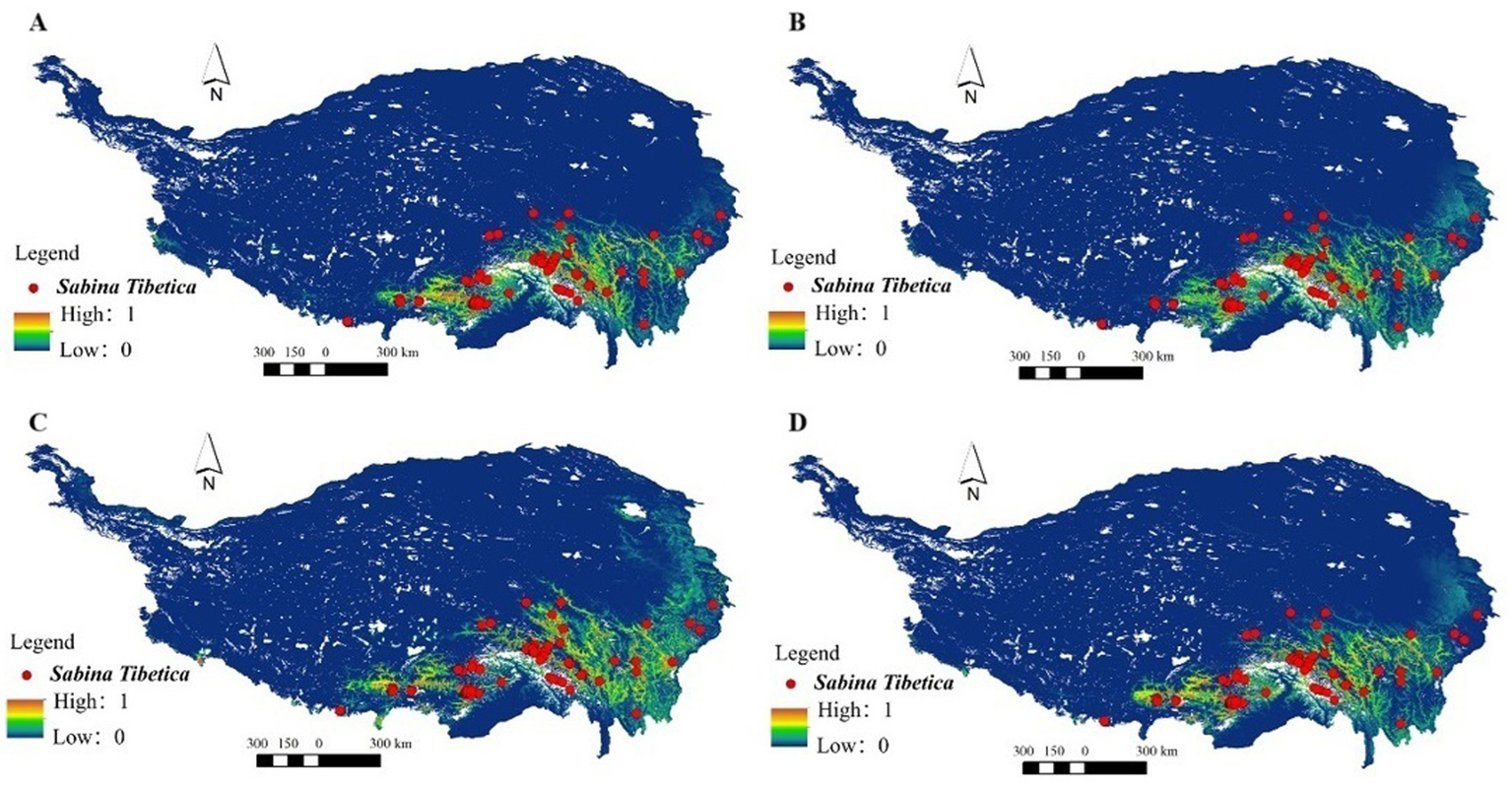 Here we conducted a study to predict the future change in geographic distribution of Tibetan juniper on the QTP. Sabina tibetica is the only woody plant occurring over large areas of high-altitude Tibet, it often grows on south-facing slopes in mountainous areas, even if the Tibetan juniper exhibits a sluggish growth rate under the severe climatic circumstances prevalent in that region, but it also providing important ecological services to human communities on Tibet (Wang et al., 2021). The study by Li et al. (2020) examined tree-ring chronologies of Tibetan juniper in the Gongga Mountains on the southeastern Tibetan Plateau. Their results showed that growth of Tibetan juniper at high-elevation sites was primarily constrained by minimum winter temperatures (bio06). compared to Abies georgei at lower elevations, potentially due to species-specific traits and altitudinal differences. He et al. (2013) investigated the growth-climate relationships of Juniperus tibetica along an altitudinal gradient on the southern Tibetan Plateau. Their results suggest that local tree growth is primarily driven by common regional climatic signals, with moisture variability during April–June having the highest impact on tree growth, even at the upper tree attitude limit. Tibetan juniper serves various purposes such as construction material, fuel, and incense. Moreover, the foliage of the tree is heavily consumed by domestic goats and other livestock (Farjon, 2005). However, these uses have led to a considerable decrease in the species’ population. Initially categorized as not threatened in 1998, it has now been reclassified as Near Threatened since 2005 (Farjon, 2013). What’s more, the growth of this tree species is sensitive to climate change and the amplitude of climate warming on the QTP is higher than the global average (Zhao et al., 2004; Lu et al., 2019). Study of the distribution change in Tibetan juniper forests in future will help assessing impacts of climate change on forest ecosystem services and planning of biodiversity protection (Birch et al., 2014; Koschke et al., 2012).