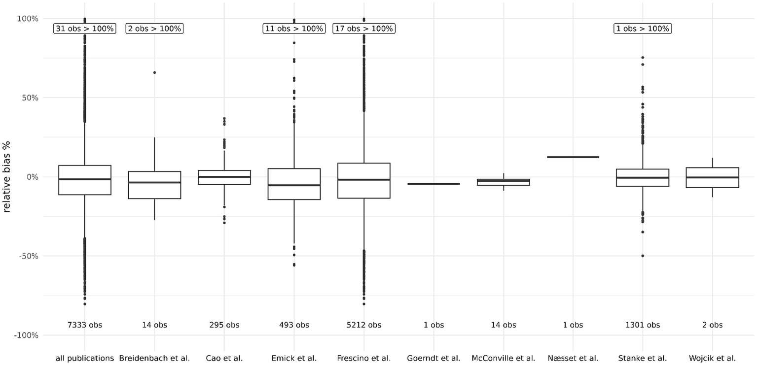 For most studies we examined, the emphasis is on estimator efficiency, i.e., the reduction of variance in the estimates (Mauro et al., 2017). While in most cases model results are reported either graphically or within the text, the actual numeric outcomes of the subdomain estimates made by the large-scale framework and the direct observations are not provided in a useable form (Saarela et al., 2015a; Magnussen et al., 2017; Green et al., 2020; Temesgen et al., 2021). Typical examples of this can be found in Figure 4 from ver Planck et al. (2018) and Figure 4B of Breidenbach et al. (2018). In these figures, you can visually compare the relationship between the design-based (SRS in ver Planck et al. (2018), Figure 4) and SAE [all points in ver Planck et al. (2018), Figure 4, and EBLUP in Breidenbach, Figure 4B]. The results of this literature data can be seen in the Results section below.
