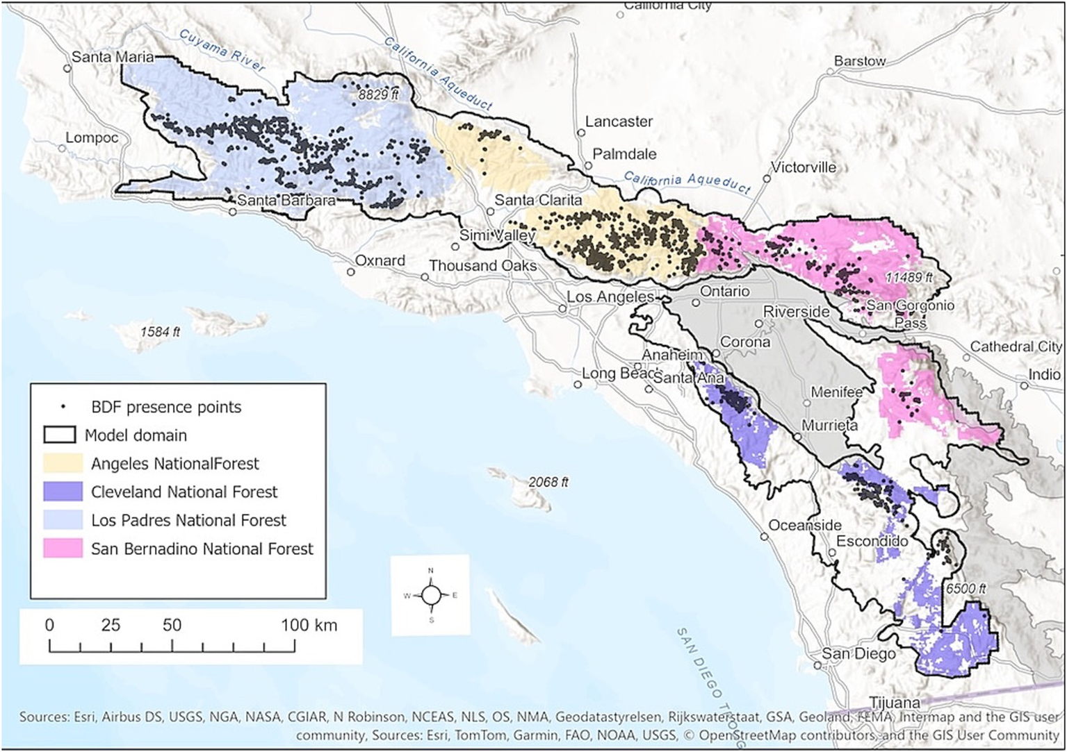 Study area map showing the model domain, presence points for BDF, and national forests of southern California. Gray regions are subsections of the Southern California Mountains and Valley Ecological Section that were excluded from the model domain.