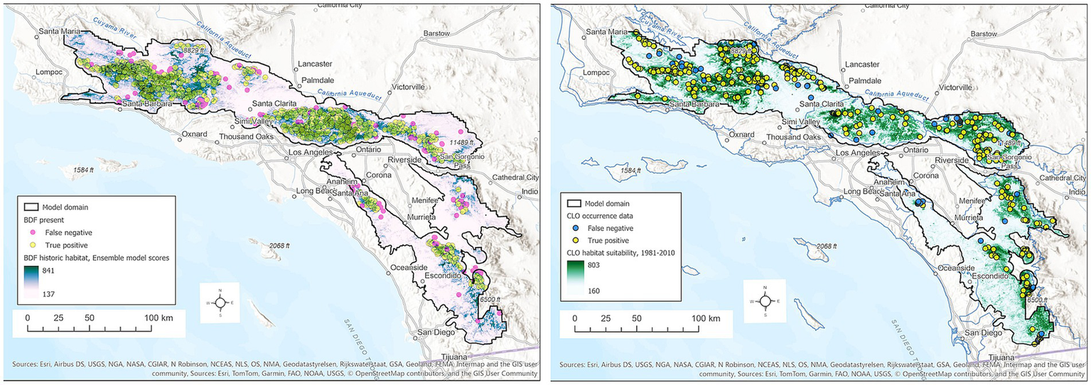 Roughly 75% of the area predicted to be CLO habitat is also predicted BDF habitat, consistent with the previously reported strong association of these species (Supplementary Table S2). The overlap in species’ habitats is lower (59–67%) in the lands off the national forests and in the more southern parts of the range such as in the Cleveland National Forest (Supplementary Table S2).