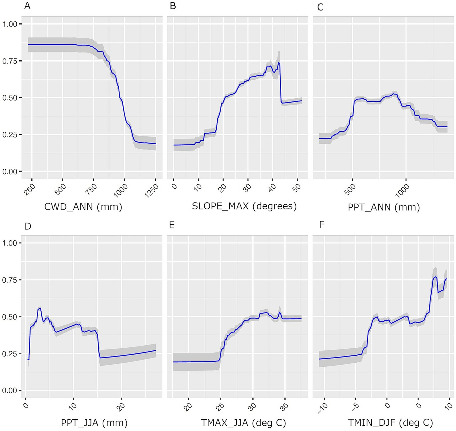 Predictor variable response curves for the BDF species distribution model produced as a performance-weighted mean of GBM and MAXENT models. Predictor variables include (A) CWD_ANN, (B) SLOPE_MAX. (C) PPT_ANN, (D) PPT_JJA, (E) TMAX_JJA, (F) TMIN_DJF. The Y-axis is habitat suitability scores, which can range from 0 to 1. The shaded areas in each plot are 95% confidence intervals.