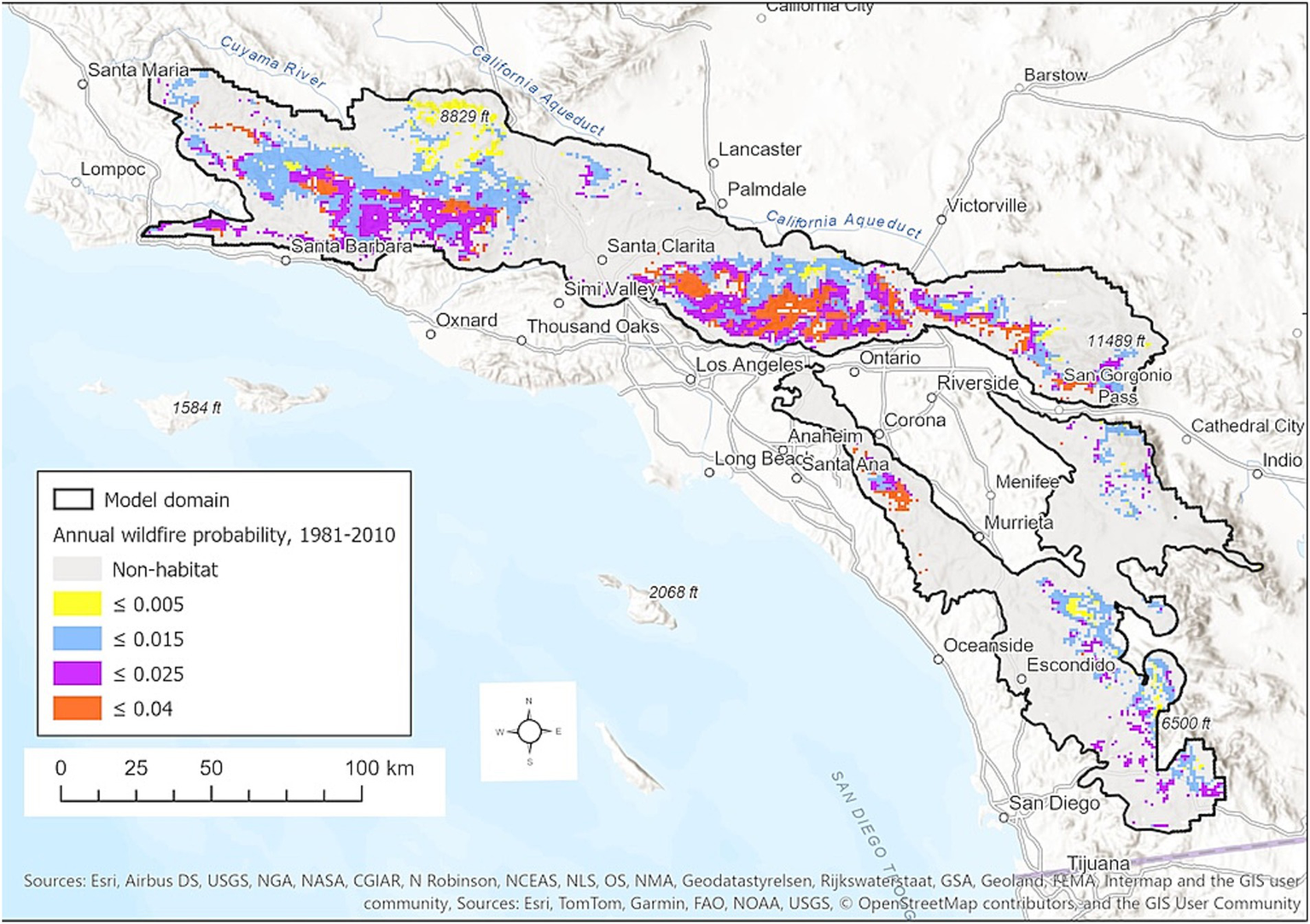 For the period 1981–2010, modeled mean annual wildfire probabilities in sites modeled as BDF habitat range from <0.005 (i.e., expected fire return interval (FRI) of 200 years) to as high as 0.04 (FRI = 25 years) (Figure 4). Areas at highest risk occur primarily in the San Gabriel Mountains, as well as the San Rafael Mountains in the Los Padres National Forest and Santa Ana Mountains in the Cleveland National Forest. Areas of lowest wildfire risk occur at lower, drier sites, particularly in the upper Cuyama River Basin of the Los Padres National Forests near BDF’s northern range limit.
