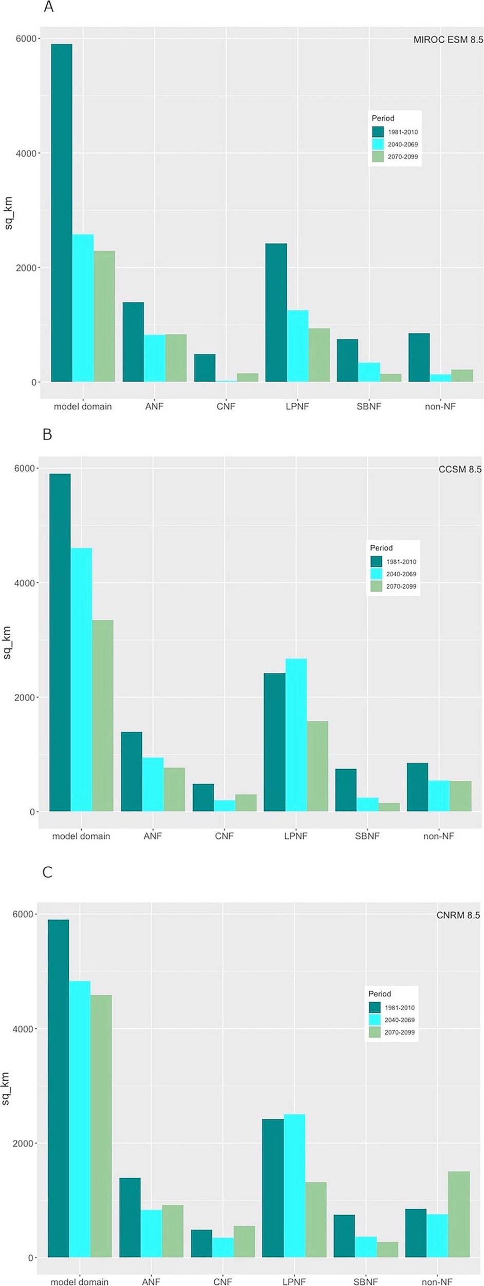 Predicted extent of BDF habitat for historic, mid-21st century and end-of-century 30-year periods for the model domain and for individual national forests based on (A) a hot-dry projection (MIROC ESM 8.5, RCP 8.5), (B) a warm projection with little rainfall change (CCSM4, RCP 8.5), and (C) a warm-wet projection (CNRM CM5, RCP 8.5).