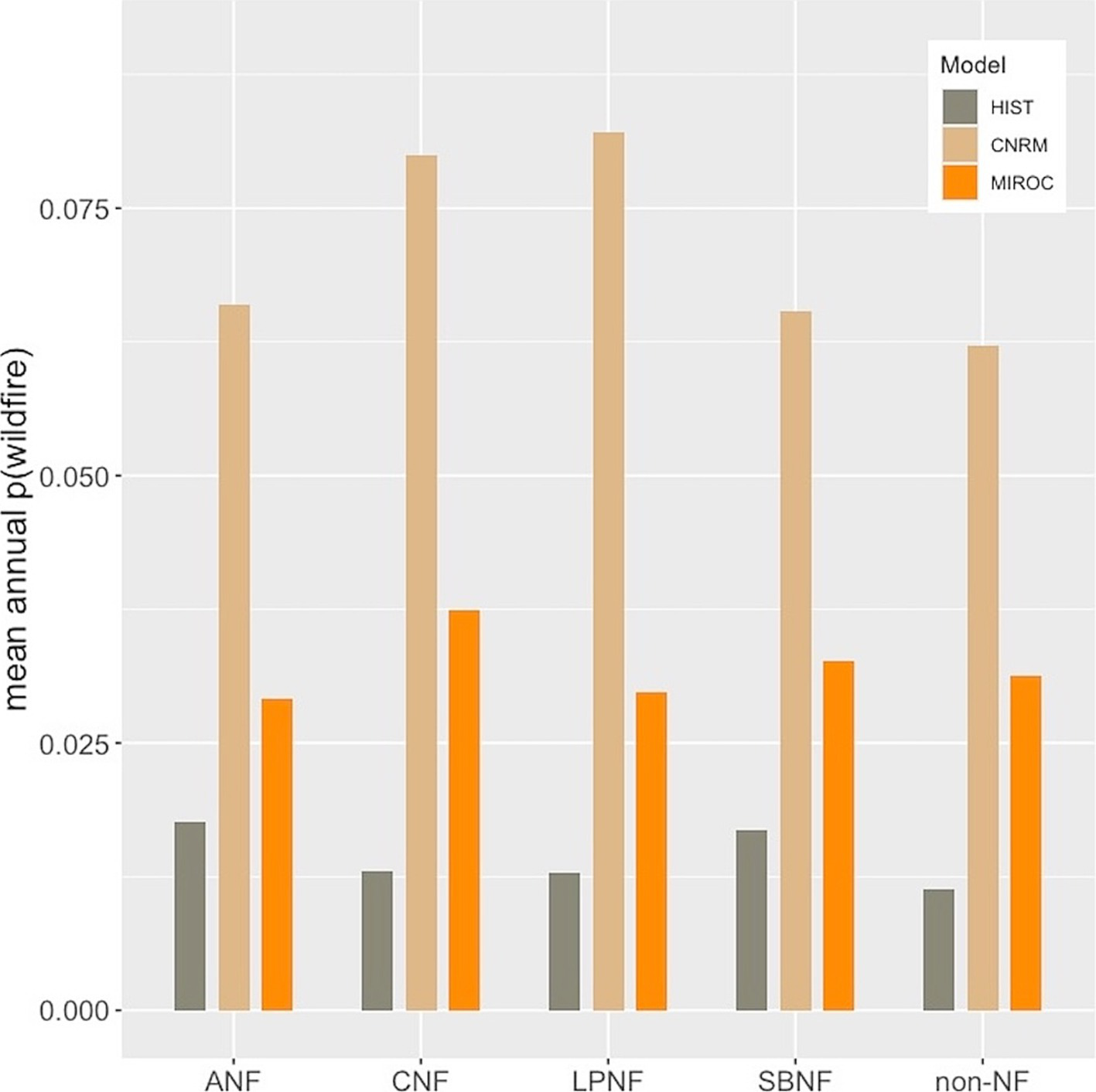 Mean annual probability of wildfire in predicted BDF habitat for the periods 1981–2010 (HIST) and 2040–2069 based on CNRM 8.5 and MIROC ESM 8.5 climate model projections.