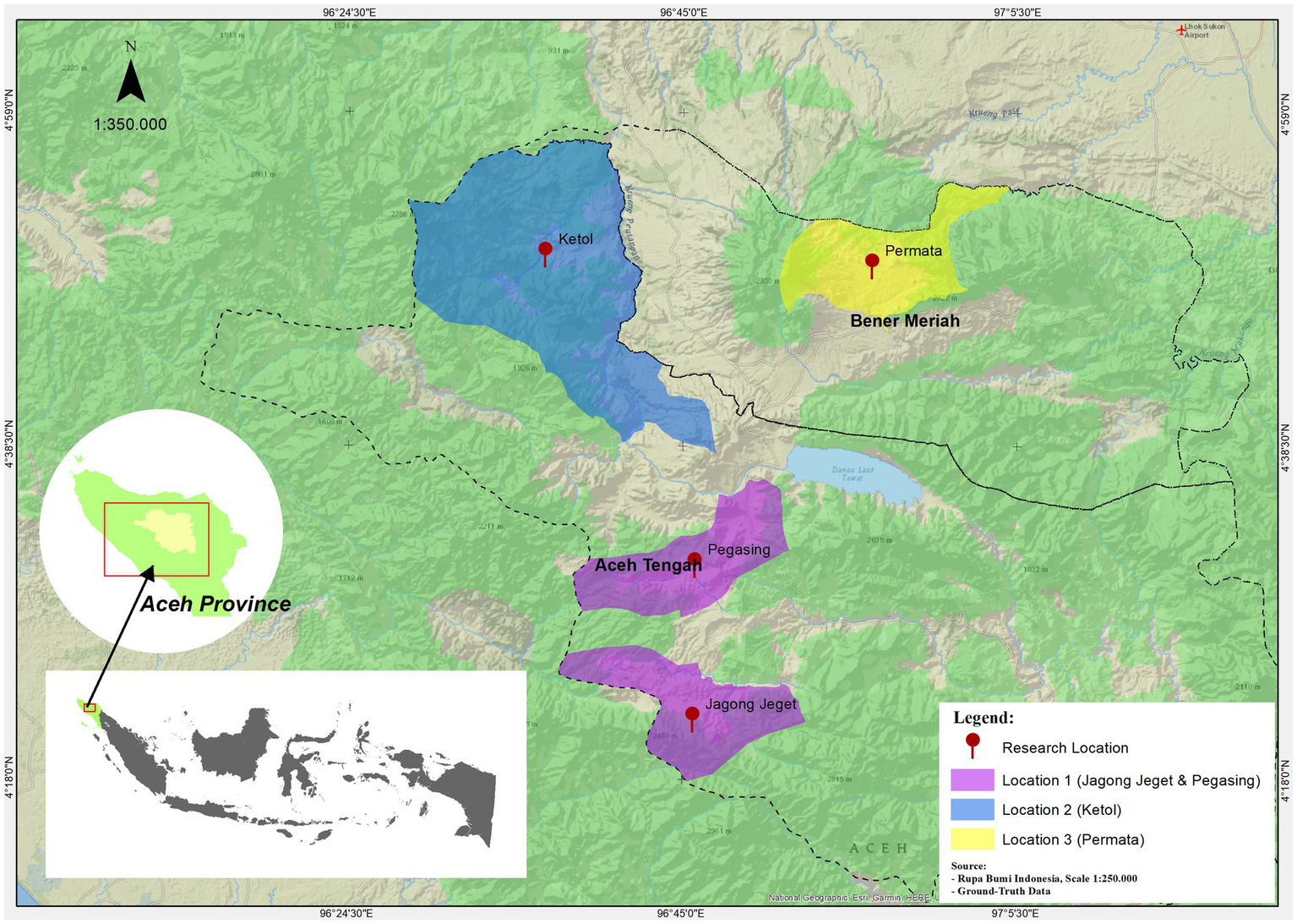 The Gayo Highlands span three adjacent districts, namely Aceh Tengah, Bener Meriah, and Gayo Lues. This area is the largest Arabica coffee producer in Indonesia (Cassamo et al., 2023). Our study location falls within the jurisdiction of Aceh Tengah, which is the main coffee producer district with the most area of coffee plantation among the three. The geographical coordinates of Aceh Tengah range from 4°22′14.42″–4°42′40.80″N and 96°15′23.60″–97°22′10.76″E. Approximately 37% of the land lies below 1,000 meters above sea level (asl), while 20.7 and 42.3% are situated at elevations between 1,000 and 1,600 meters asl, and above 1,600 meters asl, respectively (Anhar et al., 2021a). The mean annual temperature is 19°C, with humidity varying as low as 57% during dry seasons and up to 98% during rainy seasons. The mean annual rainfall in the area is 1,575 mm, with one peak in February–March and another one in October–November. Most of the district’s higher elevation zones directly bordering protected forests of primary tropical rain forest (Figure 1).