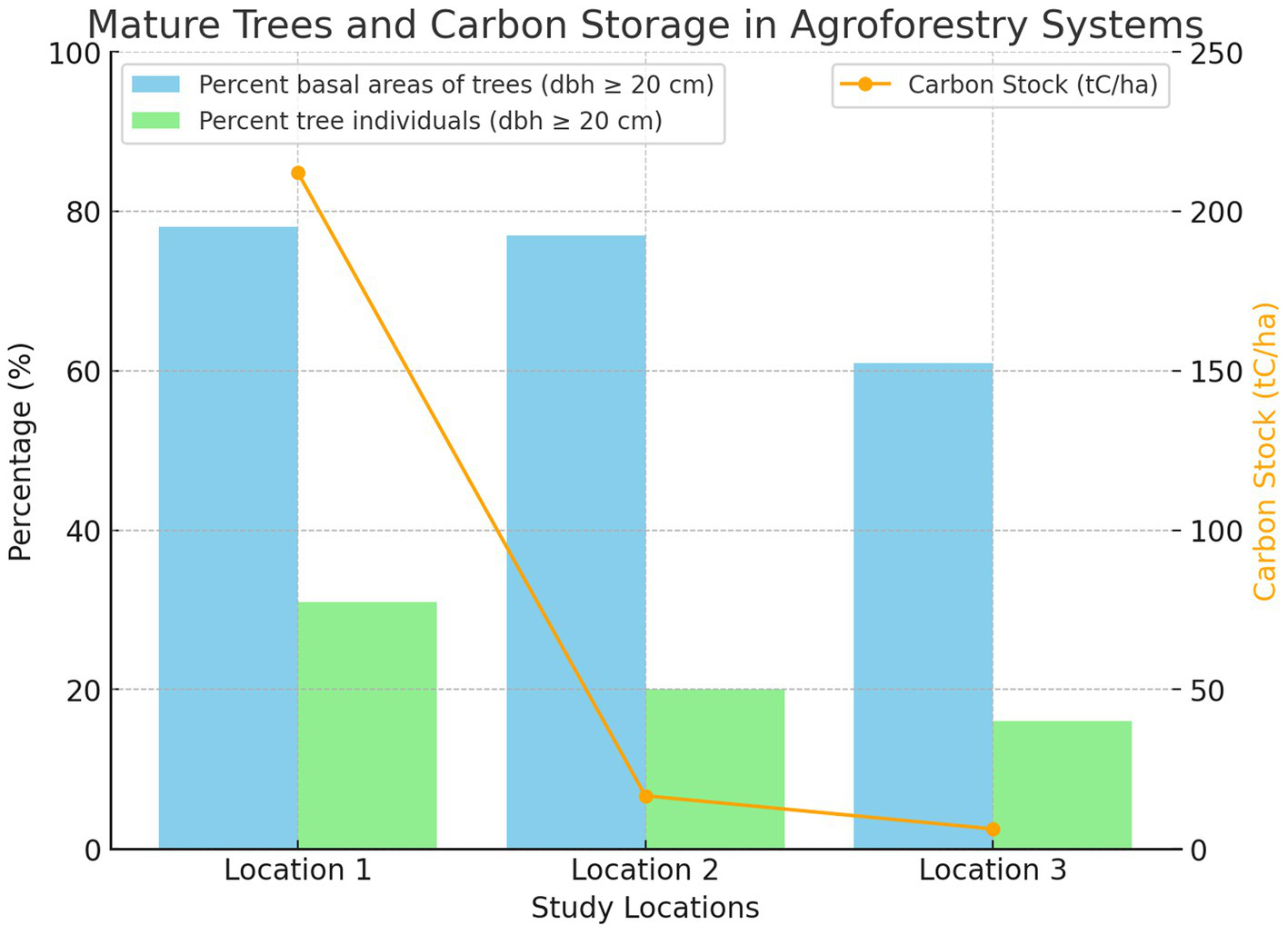 A comparative analysis of tree composition and carbon stock across three locations provided critical insights into the capacity of coffee agroforestry systems to emulate the carbon storage capabilities of secondary and primary forests. While tree species diversity plays a role in carbon sequestration, the structural characteristics of trees, particularly their DBH and basal area, have a more direct impact on carbon storage. Our hypothesis, positing that agroforestry systems incorporating 25% mature forest trees could attain comparable carbon storage levels, was partially validated. Location 1, characterized by a mature tree composition of 31%, exhibited the closest approximation to secondary forest levels. Conversely, Location 2, despite the presence of 20% mature trees, fell short of the carbon sequestration potential observed in secondary forests. To enhance carbon sequestration, strategic interventions aimed at improving tree growth, density, and diversity would be necessary. Location 3, distinguished by the lowest proportion of trees exceeding a 20 cm diameter at breast height (DBH) and the lowest carbon stock, underscored the important role of mature trees in carbon storage. These findings align with the previous research demonstrating that tree DBH and basal area are strong predictors of aboveground biomass and carbon sequestration (Ma et al., 2020; Mildrexler et al., 2020). The introduction of fast-growing tree species could potentially increase carbon storage capacity and facilitate a closer approximation to the carbon storage levels characteristic of secondary forests. This suggests that while mature tree composition is an essential factor, other ecological and management-related variables may also influence carbon sequestration efficiency.