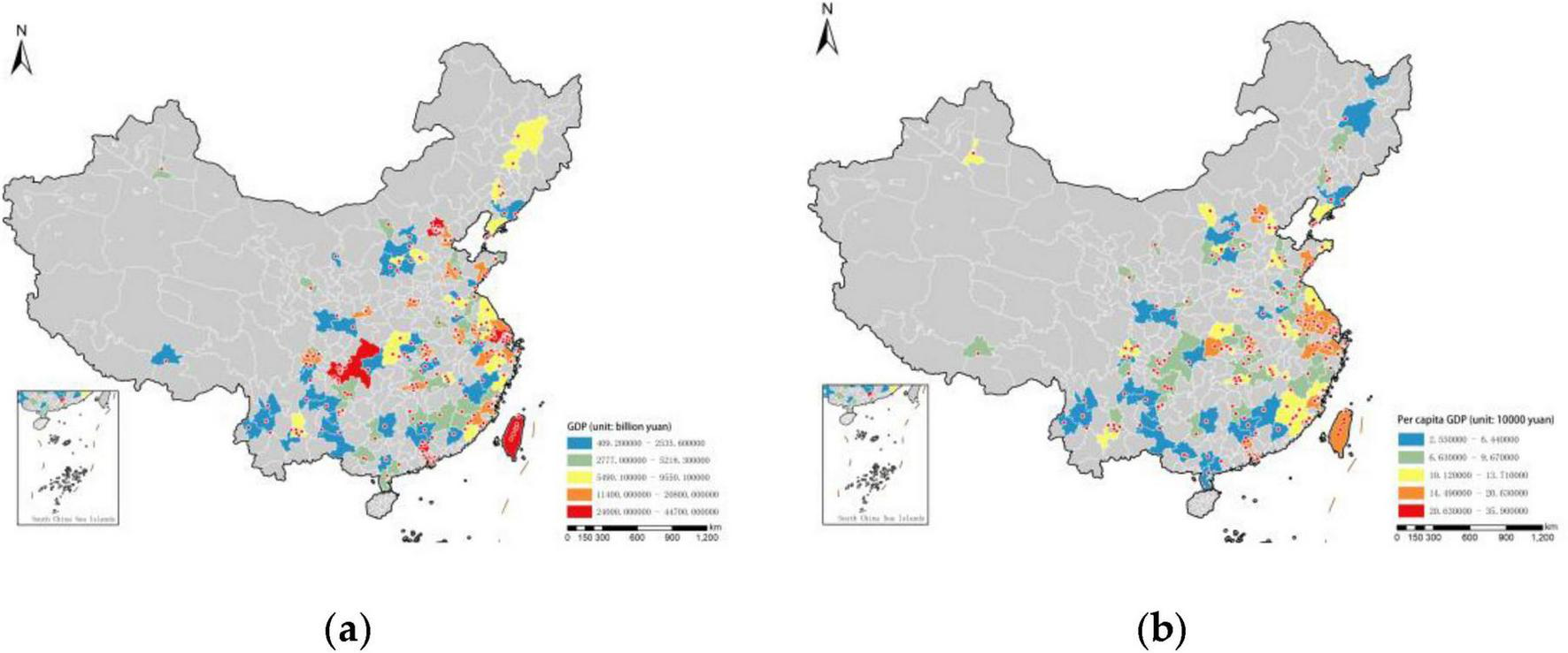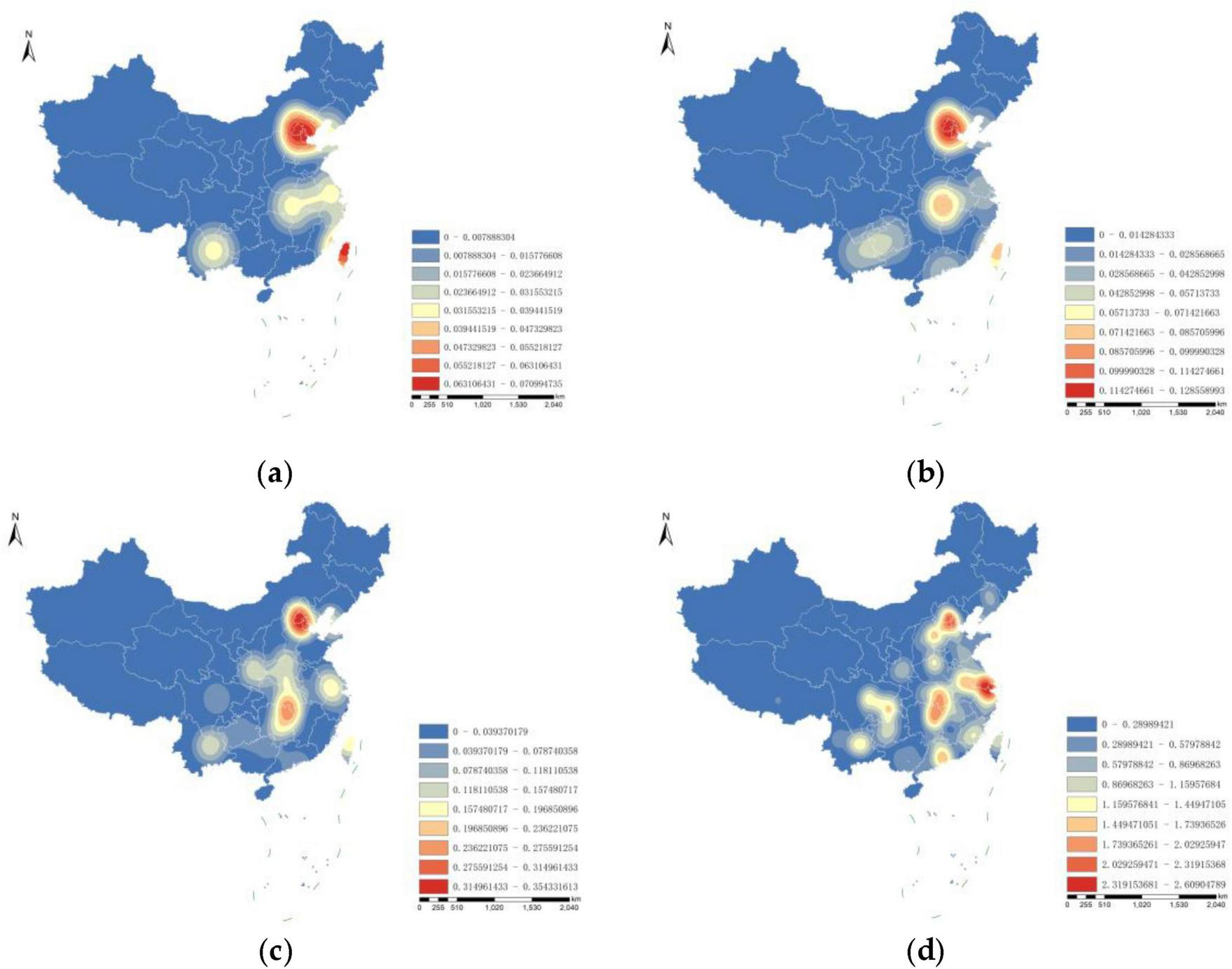 China has a long history of cherry blossom cultivation, with the earliest cherry blossom scenic spots emerging around the 1930s. Prior to 1949, there were a total of eight cherry blossom scenic spots. The nearest neighbor index R = 1.29, indicating a dispersed distribution. As shown in Figure 2a, four preliminary distribution areas have formed, with the North China region and Taiwan being high-density areas.