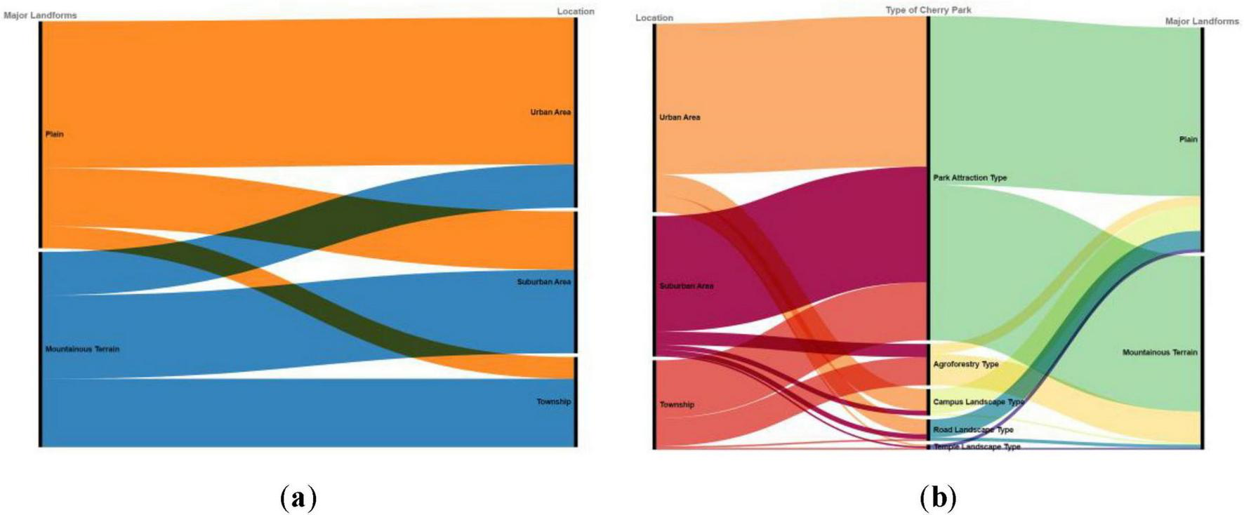 (a) Relationship between terrain types and locations of cherry blossom scenic spots. (b) Relationship among types of cherry blossom scenic spots, terrain, and location.