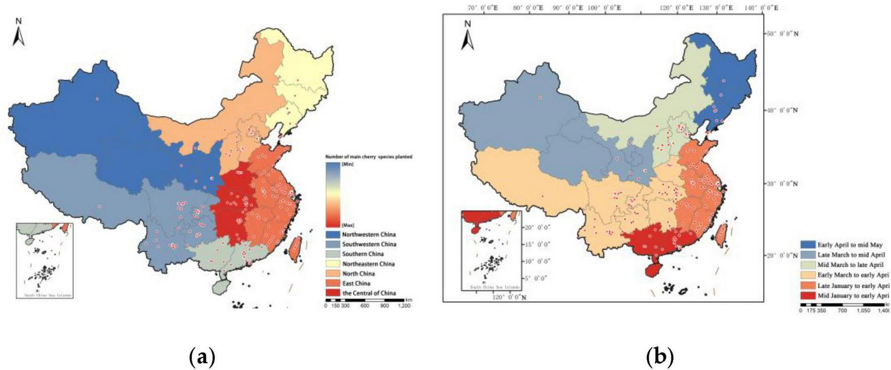 Spatial distribution characteristics of different cherry species resources. (a) Regional differences in cherry blossom species diversity. (b) Influence of latitude on cherry blossom flowering periods.