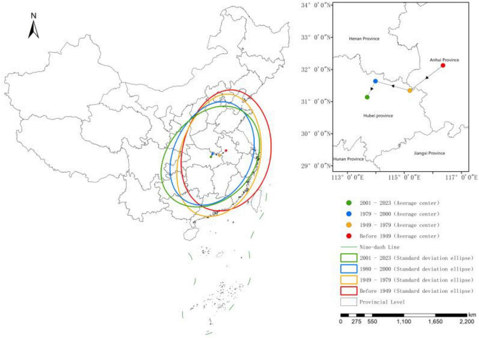 The Standard Deviational Ellipse (SDE) is an important method for exploring the directional and trend characteristics of the spatial distribution of point features, where the mean center indicates the relative position of the point features in space. The azimuth is the angle between true north and the principal axis, measured in the clockwise direction, representing the primary direction of spatial distribution (Zhang and Yang, 1984). The calculation formula Equations 4, 5 are as follow: