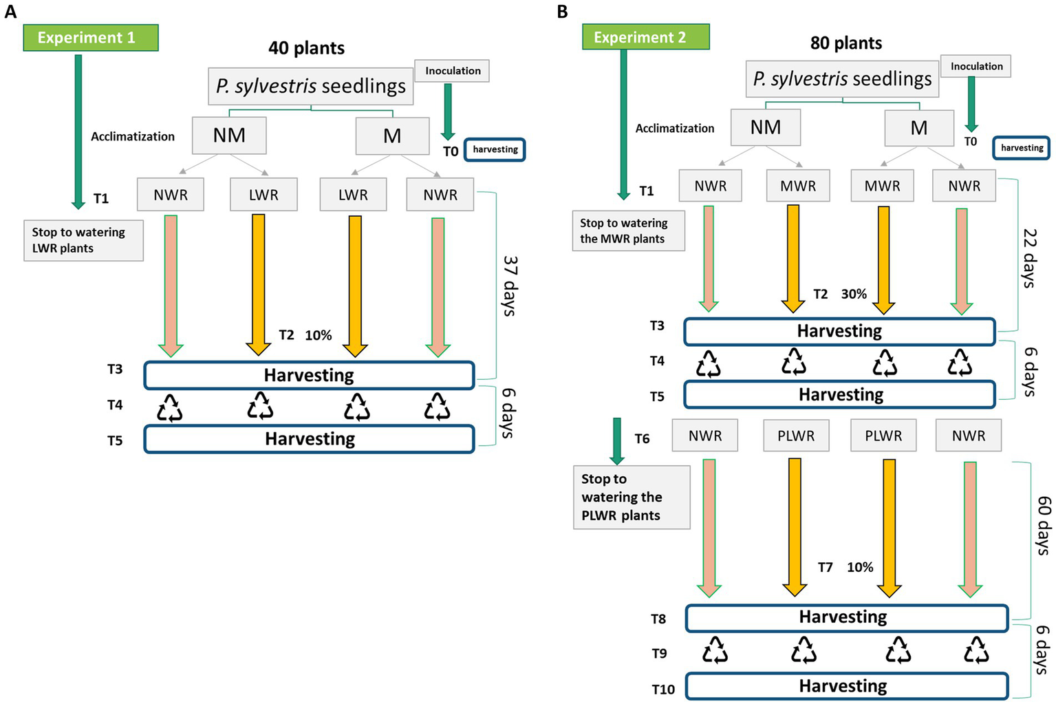 (A) Schematic representation of the experimental design for Experiment 1 and (B) for Experiment 2. NM = non-mycorrhizal plants; M = mycorrhizal plants; NWR = normal water regime (i.e., the control); LWR = low water regime (watering reduced and maintained to 10–15% RWC for 1 week); MWR = moderate water regime (watering reduced to 30–35% RWC); PLWR: prolonged low water regime (watering reduced during 30 days and maintained to 10–15% RWC for one more month). Experiment 1: T0 = Fungal inoculation; T1 = interruption of watering the LWR treatments; T2 = Containers of the LWR treatments reaching 10–15% RWC; T3 = harvesting of 20 plants (5 per treatment); T4 = Start of water circulation for 20 containers for 1 week; T5 = harvesting of 20 plants (5 per treatment). Experiment 2: T0 = Fungal inoculation; T1 = Interruption of watering the MWR treatments; T2 = Containers reaching 30–35% RWC; T3 = harvesting of 20 plants (5 per treatment); T4 = Start of water circulation for 60 containers for 1 week; T5 = harvesting of 20 plants (5 per treatment); T6 = Interruption of watering the PLWR treatments; T7 = Containers reaching 10% RWC, kept for 1 month; T8 = harvesting of 20 plants (5 per treatment); T9 = Start of water circulation for 20 containers (5 per treatment) for 1 week; T10 = harvesting of 20 plants.