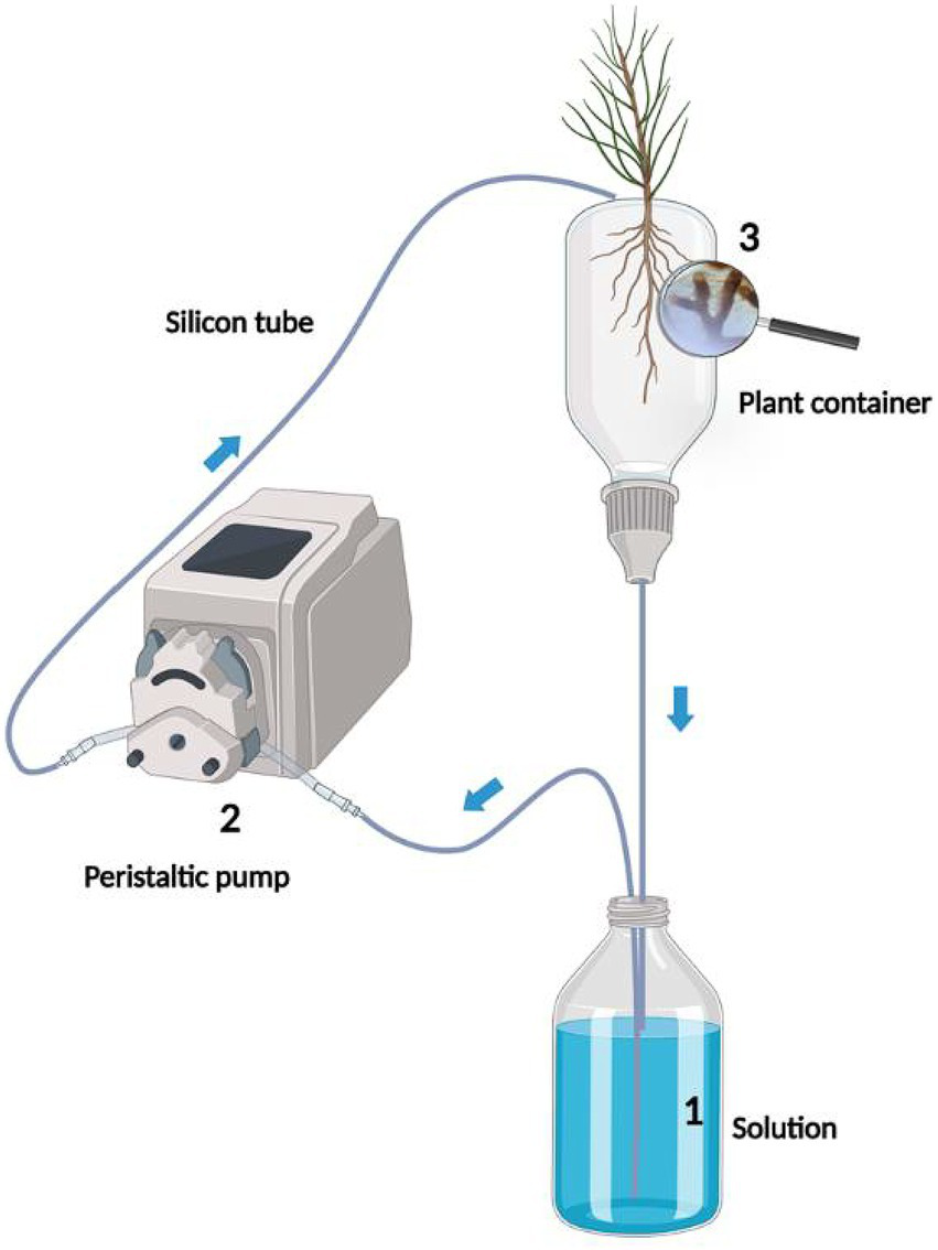 Schematic representation of the circulatory semi-hydroponic cultivation system, used to inorganic P (Pi) and NH4+ depletion in the Ingested solution circulating through the containers. The nutrient solution in the glass bottle (1) is pumped with a peristaltic pump (2) to the upper part of the container (3) via silicon tubes. The solution percolates through the plant container back into the glass bottle. Gray arrows indicate the flow direction of the nutrient solution in the tubing (Garcés-Ruiz et al., 2017; Cartabia et al., 2021).