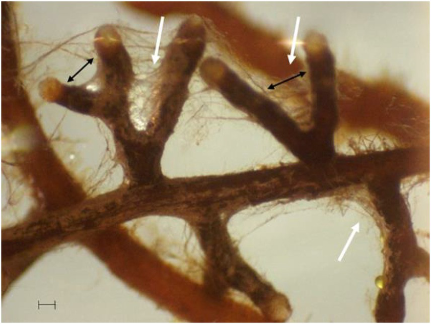 Characteristic dichotomous root tips induced by P. involutus in P. sylvestris seedlings (black double arrows), surrounded by mycelium (white arrows). Scale bar = 1 μm.