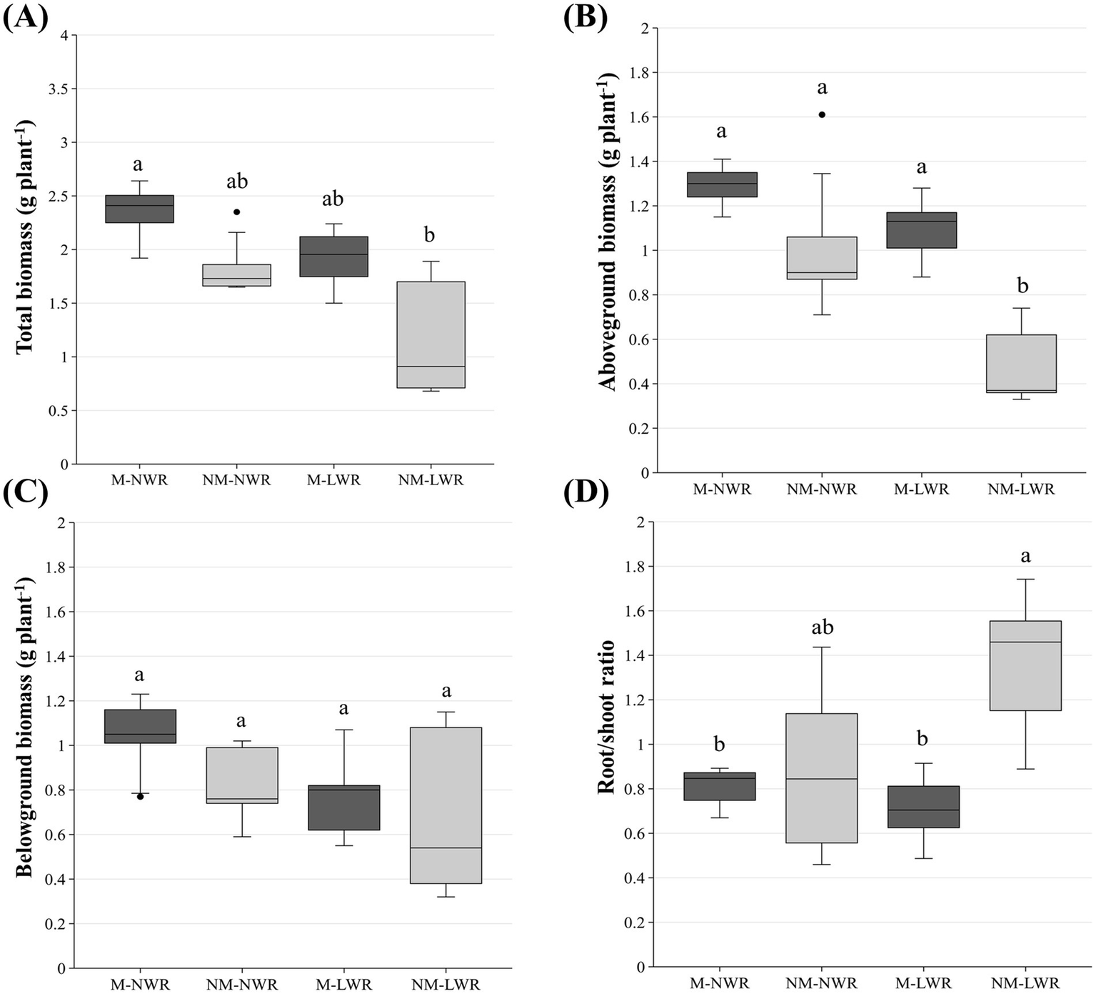 Exp 1: impact of water regime and root colonization of P. sylvestris by P. involutus on (A) total plant biomass (i.e., shoot + roots); (B) on aboveground biomass, (C) on belowground biomass and (D) on root/shoot ratio. The box plot displays the interquartile range (IQR) of the scores (central boxes), with the lower edge of the box indicating the first quartile and the upper edge marking the third quartile. The horizontal line inside each box represents the median score. The whiskers extend to the smallest and largest values within 1.5 * IQR from the first and third quartiles. Scores outside this range are considered outliers and are depicted as individual points. Data (n = 5) were analyzed by a GLM followed by a Tukey post-hoc test (p ≤ 0.05). Different lower-case letters indicate significant differences between the treatments. LWR: low water regime; NWR: normal water regime; M: mycorrhizal plants; NM: non-mycorrhizal plants.