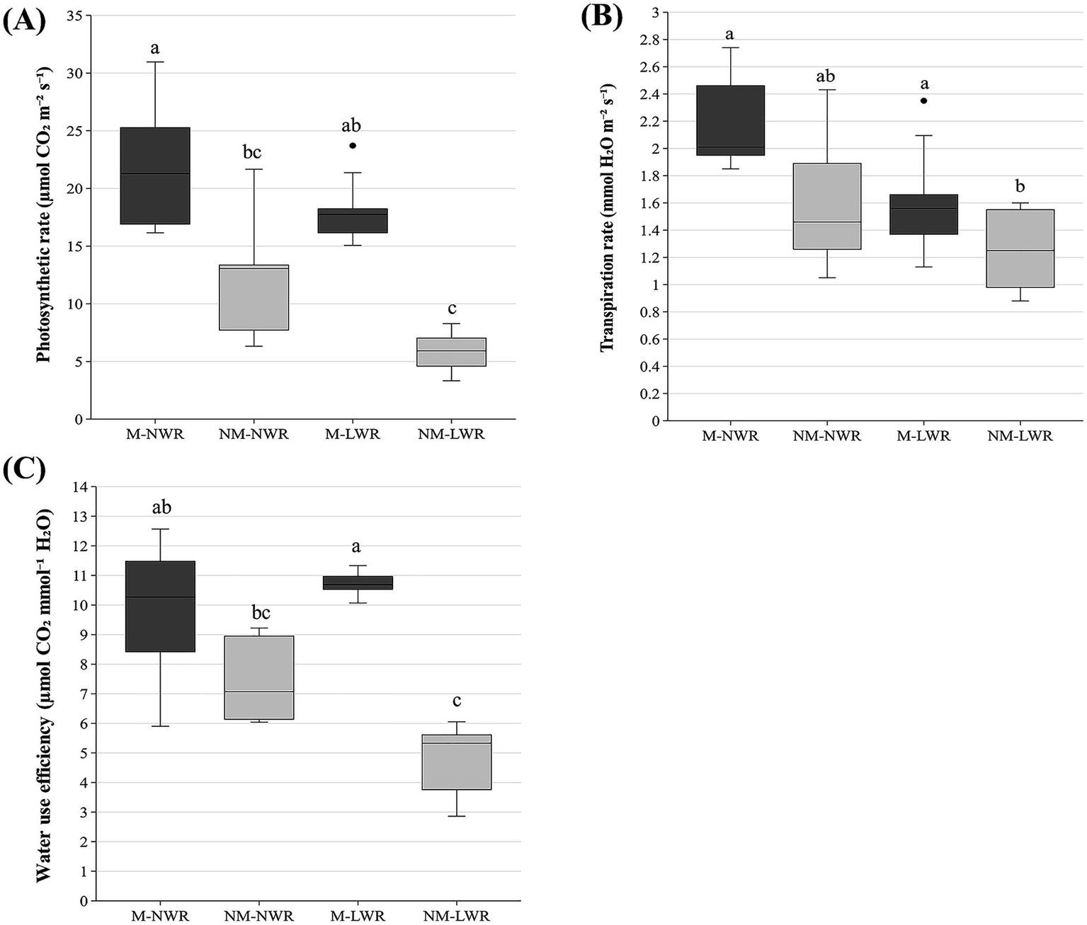 Exp 1: impact of water regime and root colonization of P. sylvestris by P. involutus on (A) photosynthetic rate (B) transpiration rate and (C) water use efficiency. The box plot displays the IQR of the scores, with the lower edge of the box indicating the first quartile and the upper edge marking the third quartile. The horizontal line inside each box represents the median score. The whiskers extend to the smallest and largest values within 1.5 * IQR from the first and third quartiles. Scores outside this range are considered outliers and are depicted as individual points. Data (n = 5) were analyzed by a GLM followed by a Tukey post-hoc test (p ≤ 0.05). Different lower-case letters indicate significant differences between the treatments. LWR: low water regime; NWR: normal water regime; M: mycorrhizal plants; NM: non-mycorrhizal plants.