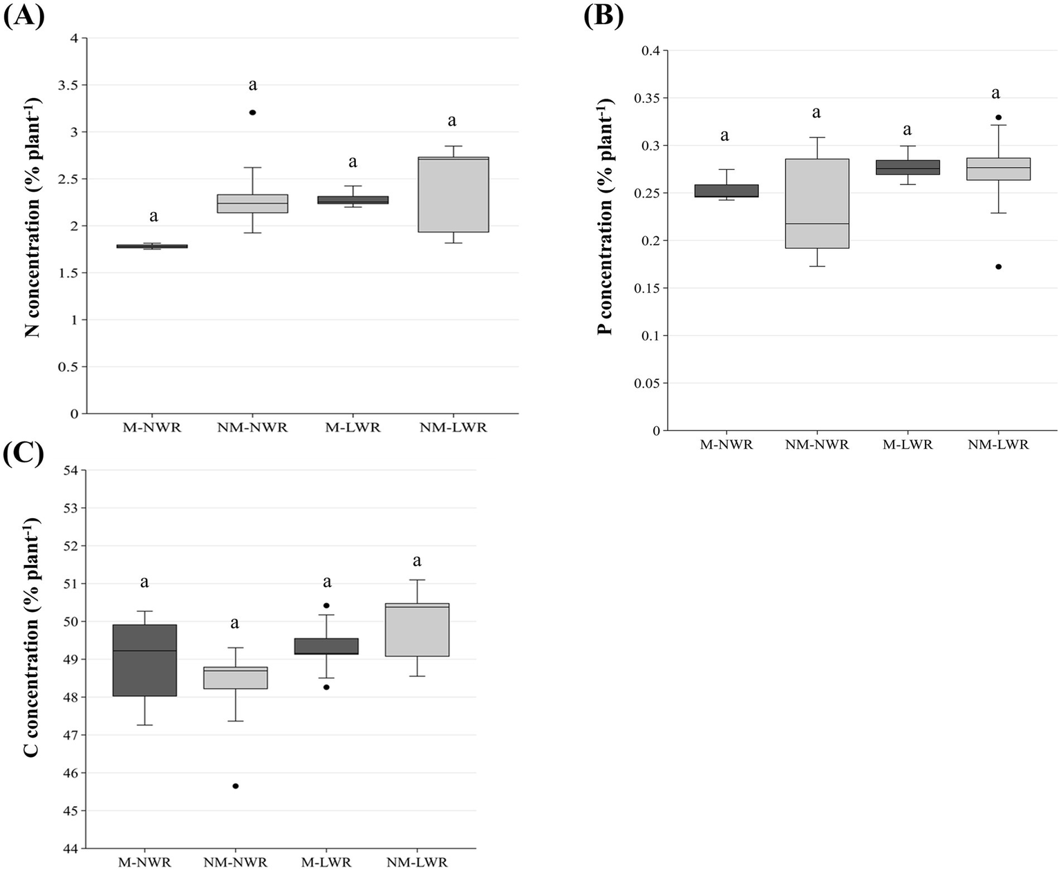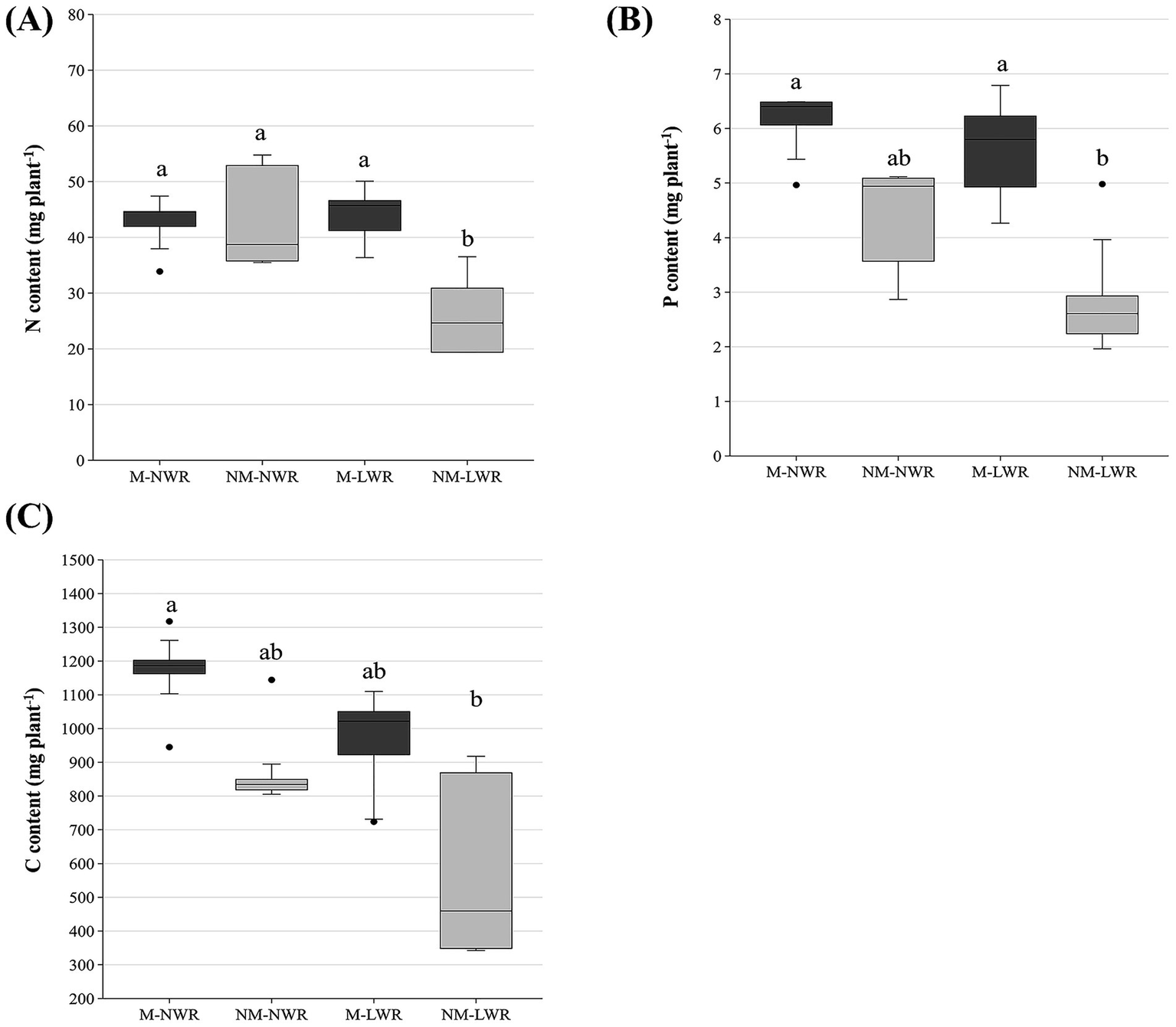 Nitrogen, P and C concentrations of plants were not significantly impacted by the factors Myc and WR (Figure 6). Conversely, the N content of plants was significantly impacted by the factor Myc (F₁, ₁₆ = 4.80, p < 0.05), the factor WR (F₁, ₁₆ = 5.00, p < 0.05) and their interaction (F₁, ₁₆ = 6.90, p < 0.05). Pairwise comparisons showed that N content was significantly lower in the plants of the NM-LWR treatment compared to the plants in the other treatments (Figure 7A). Plant P content was also affected by the factor Myc (F₁,₁₆ = 18.2, p < 0.001) and WR (F₁,₁₆ = 4.70, p < 0.05) but not by their interaction. The total P content in the plants of the NM-LWR treatment was significantly lower compared to that of the plants in the M treatments but did not differ from those in the NM-NWR treatment (Figure 7B). The total C content of the plants was also significantly impacted by the factor Myc (F₁,₁₆ = 10.7, p < 0.01) and the factor WR (F₁,₁₆ = 7.30, p < 0.05). No effect of the interaction between factors Myc x WR was found for this parameter. Pairwise comparison showed that the total C content of the plants of the NM-LWR treatment was significantly lower compared to that of the plants in the M-NWR treatment, but did not differ from the two other treatments (Figure 7C).