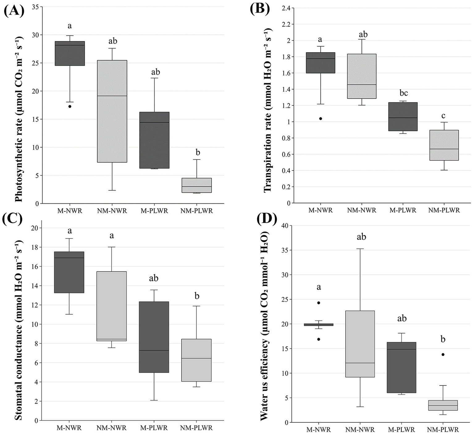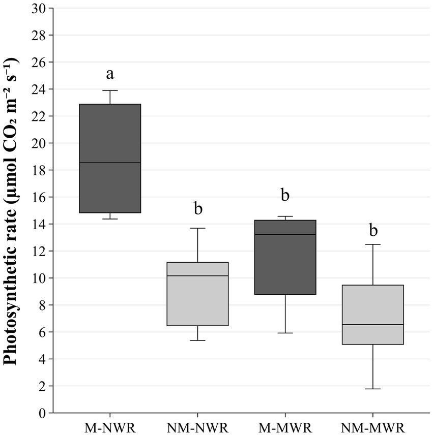 Exp 2: impact of water regime and root colonization of P. sylvestris by P. involutus on photosynthetic rate after recovery phase. The box plot displays the IQR of the scores, with the lower edge of the box indicating the first quartile and the upper edge marking the third quartile. The horizontal line inside each box represents the median score. The whiskers extend to the smallest and largest values within 1.5 * IQR from the first and third quartiles. Scores outside this range are considered outliers and are depicted as individual points. Data (n = 5) were analyzed by a GLM followed by a Tukey post-hoc test (p ≤ 0.05). Different lower-case letters indicate significant differences between the treatments. MWR: moderate water regime; NWR: normal water regime; M: mycorrhizal plants; NM: non-mycorrhizal plants.