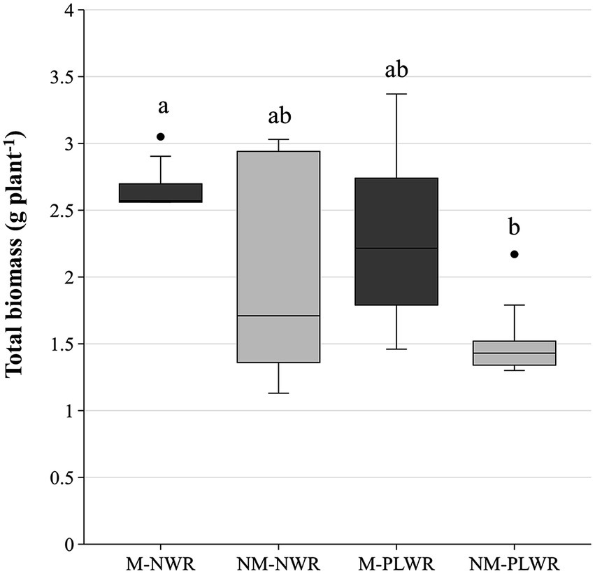 Total plant biomass (i.e., shoot + roots) was significantly affected by the factor Myc (F₁, ₁₆ = 3.23, p < 0.01) and the factor WR (F₁, ₁₆ = 2.90, p < 0.05). No interaction effect was observed between both factors. Pairwise comparisons showed that the total plant biomass in the NM-LWR treatment was significantly lower than that of the plants in the M-NWR treatment. No other differences were observed among the treatments (Figure 4A). A major impact of the factors Myc and WR was observed on the aboveground biomass of the plants of the NM-LWR treatment (F₁, ₁₆ = 10.4, p < 0.001, F₁, ₁₆ = 8.42, p < 0.005, respectively), with values significantly lower than that of all other treatments (Figure 4B). The LWR impacted aboveground biomass but not belowground biomass (Figure 4C). The factor Myc significantly impacted the root/shoot ratio (F₁, ₁₆ = 6.11, p < 0.05), while the factor WR had no significant effect on this parameter. Pairwise comparisons showed that the plants grown in the M-NWR and M-LWR had a significantly lower root/shoot ratio than those grown in the NM-LWR treatment (Figure 4D). An ANCOVA was performed to assess the effect of treatment on the root/shoot ratio with total biomass as covariate. The analysis showed that treatment had a significant effect (p < 0.05), while total biomass and its interaction with treatment were not significant (p > 0.05), indicating that treatment differences in root/shoot ratio were independent of plant size.