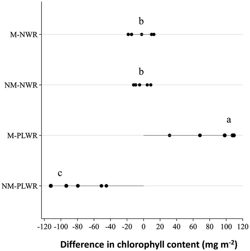 Plant growth and physiological parameters were not affected by the factor Myc, while the factor WR affected significantly the photosynthetic rate (F₁,₁₆ = 4.60, p < 0.05), the transpiration rate (F₁,₁₆ = 5.30, p < 0.05), stomatal conductance (F₁,₁₆ = 4.70, p < 0.05) with a decrease of 24.1, 17.5 and 19.8%, respectively, in plants of the LWR treatment compared to those in the NWR treatment. Water use efficiency was not affected by neither factor (Supplementary material S2). In plants subjected to LWR, the difference in chlorophyll content before and after recovery was not significantly impacted by the factors Myc and WR (Supplementary material S2).