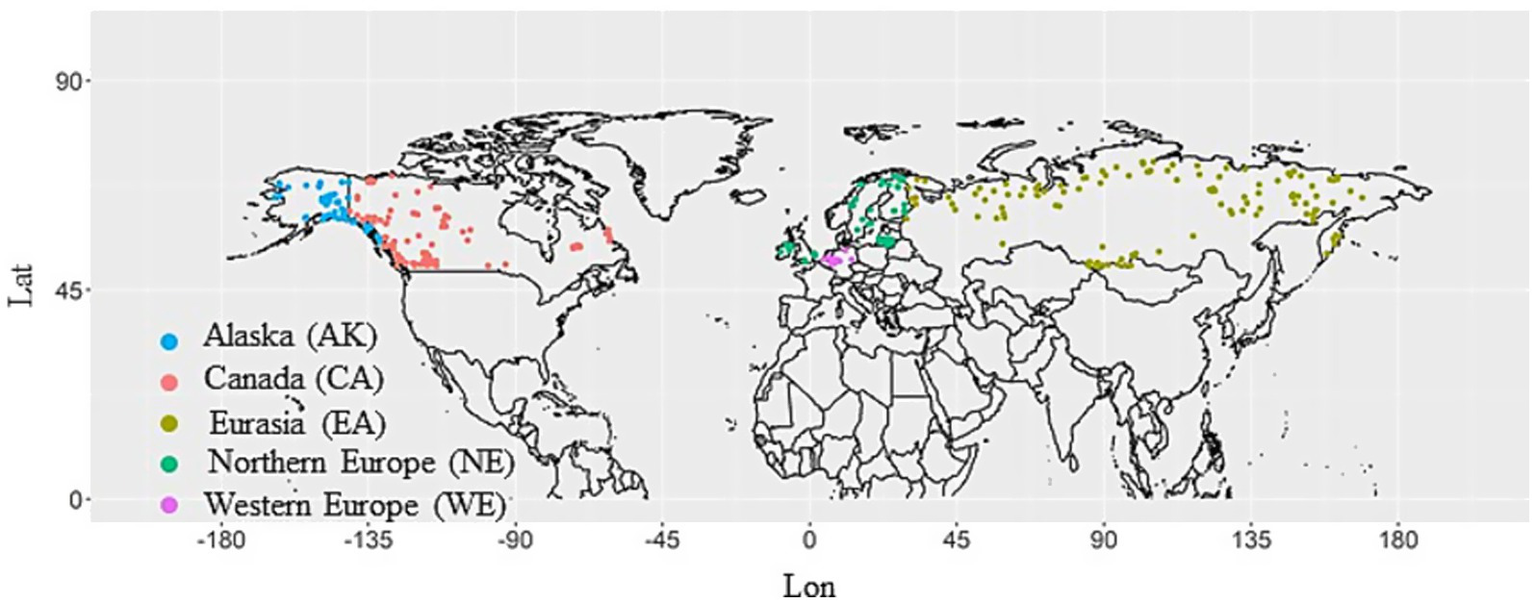 Figure 1. Regional classification as provided in the International Tree-Ring Data Bank (ITRDB) sites. We classified ITRDB sites into five regions, i.e., Canada (CA), Alaska (AK), Eurasia (EA), Northern Europe (NE), and Western Europe (WE). The regional classification follows the description in ITRDB.