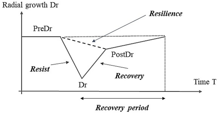 Quantitatively, resilience has been assessed using resistance (Rt), recovery (Rc), and resilience (Rs) (Lloret et al., 2011). These components have been widely used to evaluate forest stability and adaptation to climate change (Merlin et al., 2015) and have been particularly applied to gauge tree responses to severe drought events (Bose et al., 2020; Bottero et al., 2021).