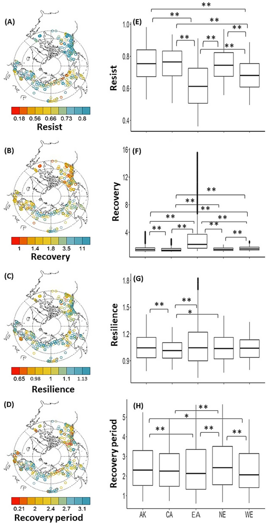 Methods: This study estimated the past EGR events and associated resilience components using the tree-ring width index (RWI) data from 523 International Tree-Ring Data Bank (ITRDB) sites across the northern high-latitude regions and analyzed the spatial and temporal variations in resilience.