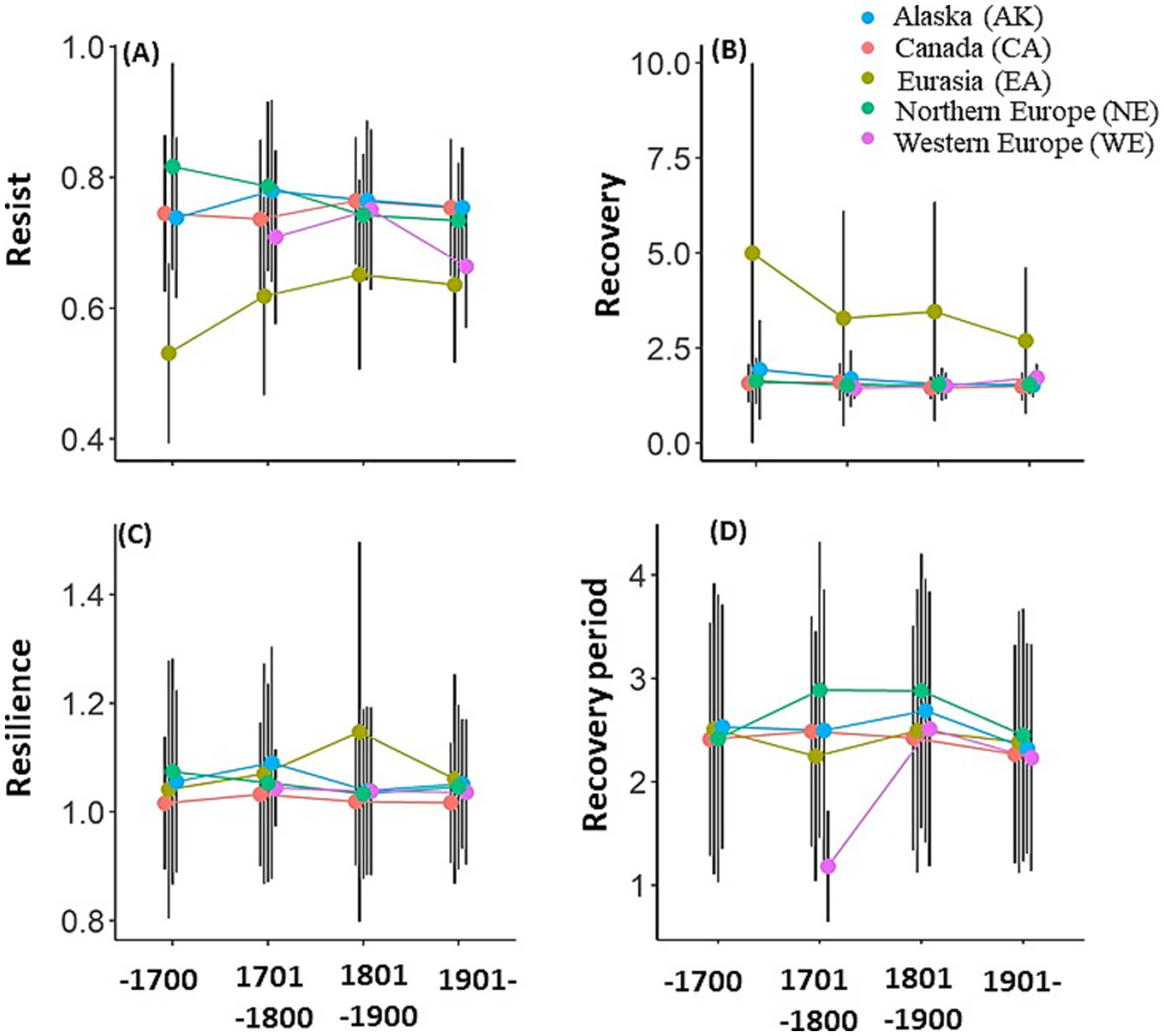Results: No significant regional differences were found in the frequency of EGR events over the past several hundred years; however, the resilience components exhibited large spatial variations with significant regional differences. The regional-averaged resilience (Rs) over the entire analysis period was lower in Canada than in Alaska, Eurasia, or Europe, suggesting a possible higher vulnerability to EGR events in Canada.