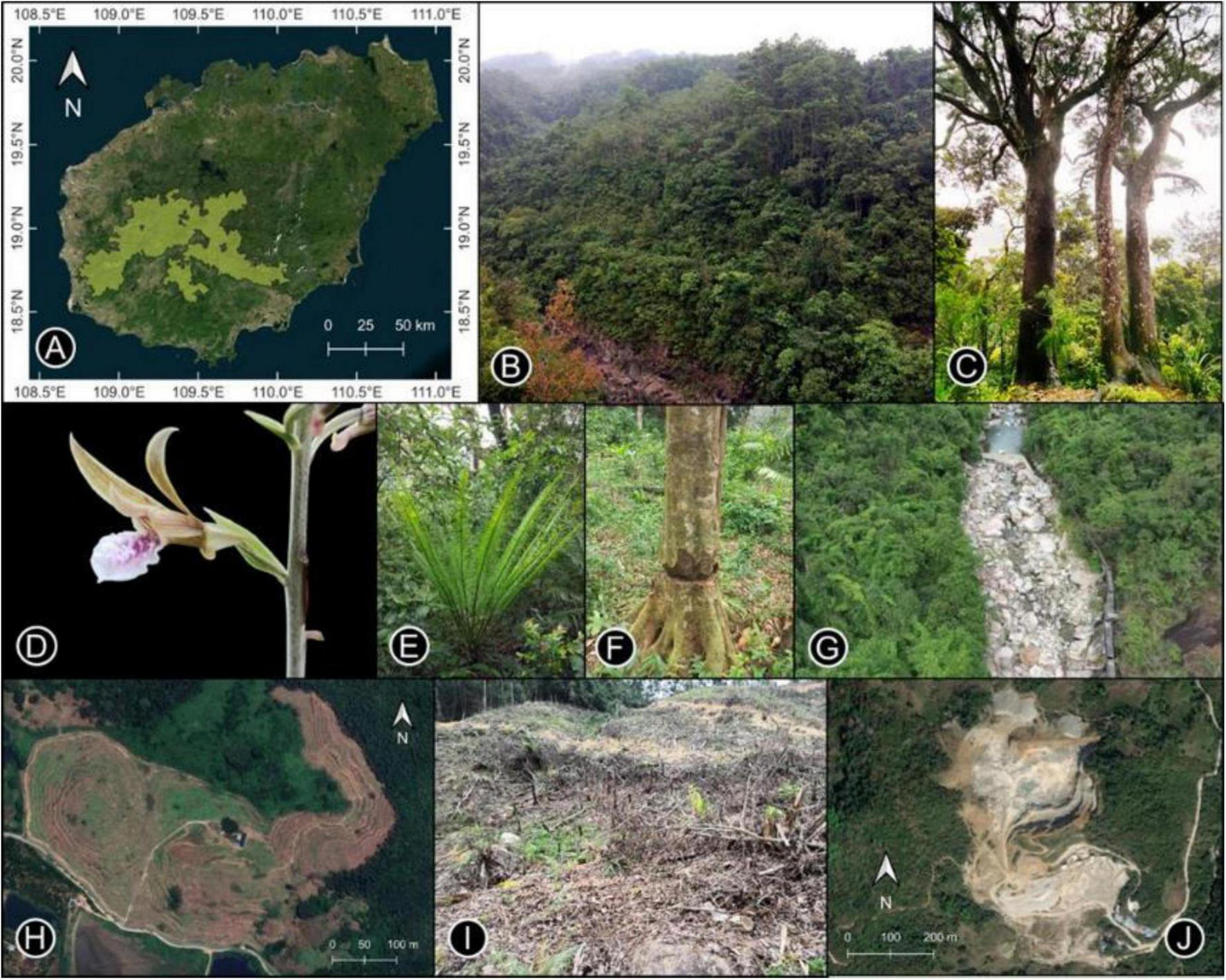 Geographic context, biodiversity representation, and anthropogenic impacts in Hainan Tropical Rainforest National Park (HTRNP). (A) Geographic location of HTRNP (light green) within Hainan Island, encompassing 4,400 km2 (12.98% of the island’s total area). (B) Representative intact tropical rainforest community phisiognomy. (C) Large and old Dacrydium pectinatum in Diaoluo Mountain, exemplifying old-growth forest characteristics. (D)Eulophia graminea, a national second-class protected orchid species. (E)Cycas taiwaniana, a national first-class protected cycad species. (F) Forest degradation resulting from intentional anthropogenic disturbance. (G) Hydropower station construction within the protected area, showing significant downstream channel disruption and exposed riverbed (source: Central Ecological and Environmental Protection Supervision and Coordination Bureau, 2023). (H) Conversion of ecological public welfare forest to coffee plantation (Bing satellite imagery). (I) Forest clearance for cash crop cultivation. (J) A quarry site showing lack of ecological restoration efforts (Bing satellite imagery).