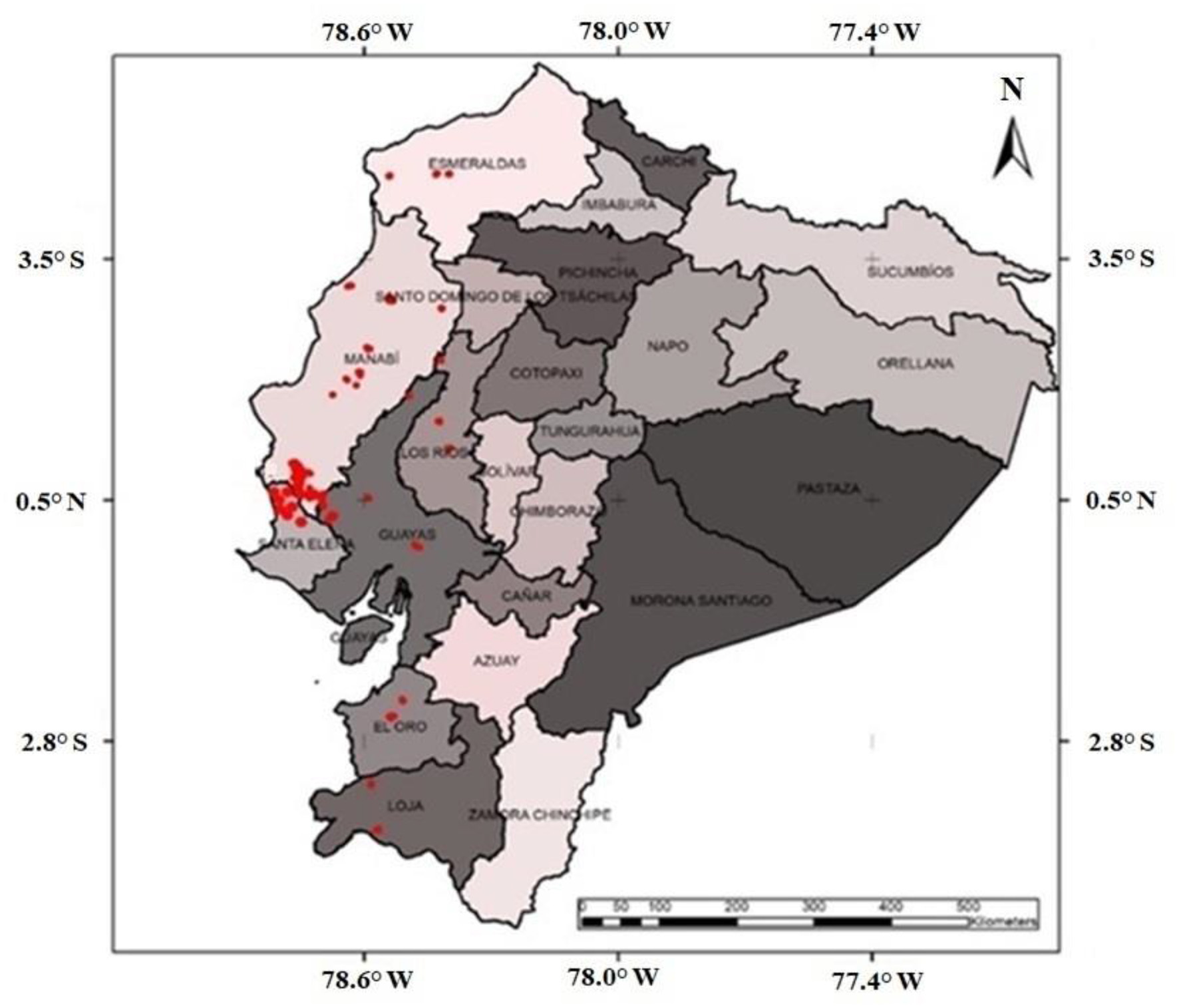 As part of the reforestation project Chongón Colonche, managed by the Ecuadorian Ministry of Environment, Fundación Natura (a Local NGO), and the German Kreditanstalt für Wiederaufbau (KfW) since 1999, a total of 2,231 hectares with 45 different tree species have been planted in the provinces of Manabí, Santa Elena, and Guayas. Eleven different reforestation systems were promoted. The systems with the fewest trees were the preferred ones. The spacing of the trees and the distribution in the reforestation area were pre-established by the project, and the incentive payments were prorated over 3 years to ensure that the plantations were established and payments were made per hectare (Cañadas-López and Roca, 2011). One of the species planted was AG, arranged in live fences forming SPS. Additional plots were established in Esmeraldas, El Oro, Guayas, Los Ríos, and Loja through research projects conducted by the National Institute of Agricultural Research (INIAP), the Technical University of the North (UTN), SEK International University (UISEK), and the Eloy Alfaro Laica University of Manabí (ULEAM).