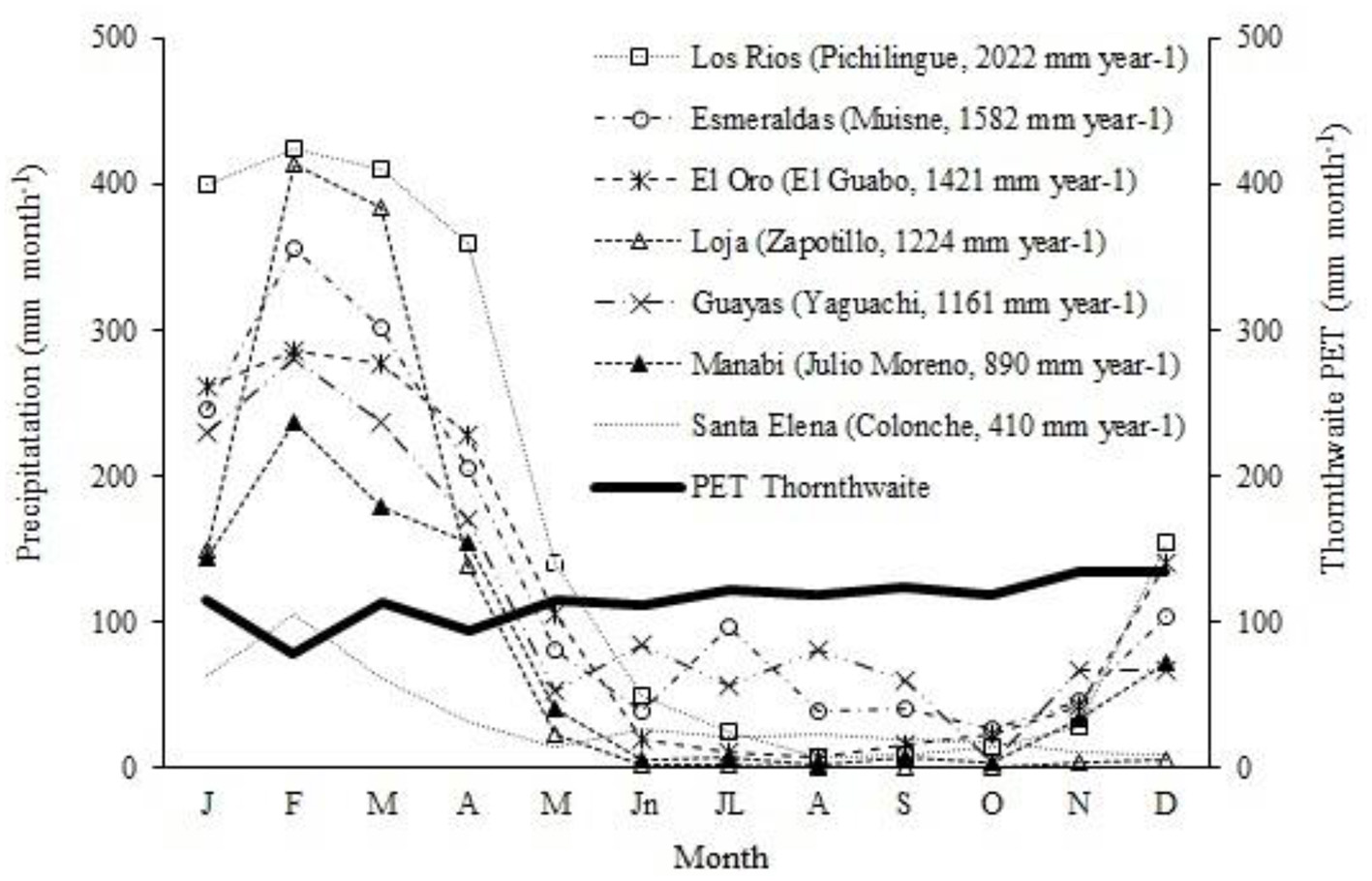 The monthly precipitation distribution by province in the main SPS sites of the study region is unimodal. When plotted against the monthly evapotranspiration calculated using the Thornthwaite formula (Cañadas, 1966, 1982, 1983; Rade-Loor et al., 2017, 2025), a gradient of average annual precipitation intensity and the range of water deficit by month can be observed (Figure 2).
