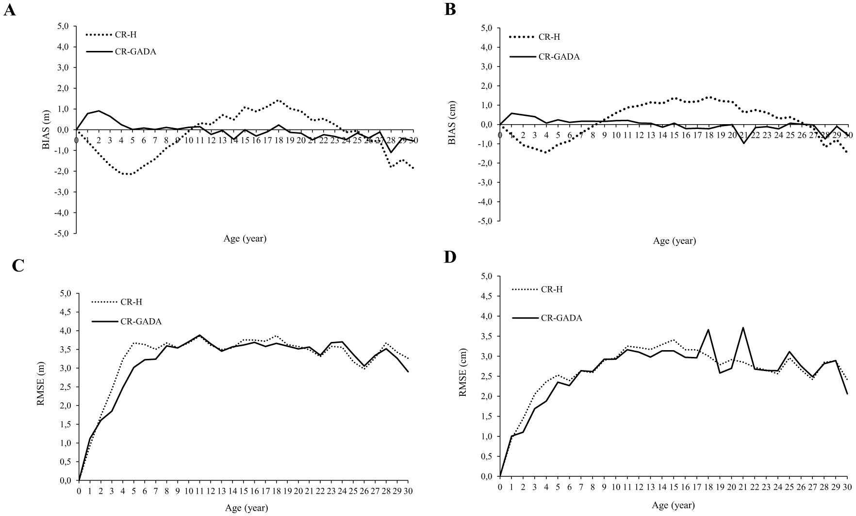 The model fitting analysis for the CR-GADA (Equation 6) and CR-H (Equation 13) was based on R2Adj calculation of the BIAS and the root mean square error (RMSE) of the models and their graphical comparison across age classes and the Akaike's Information Criterion (AIC) (Snipes and Taylor, 2014). Using the createFolds function in R (R Core Team, 2020, 2023), the models were evaluated through 10-fold cross-validation, where 90% of the dataset was used as the training set and the remaining 10% as the test set (Hastie et al., 2009). A likelihood ratio test (Cavanaugh and Neath, 2019) was performed in R, and the corresponding p-value was obtained (R Core Team, 2023) to determine whether the differences in AIC values between CR-GADA and CR-H were statistically significant.