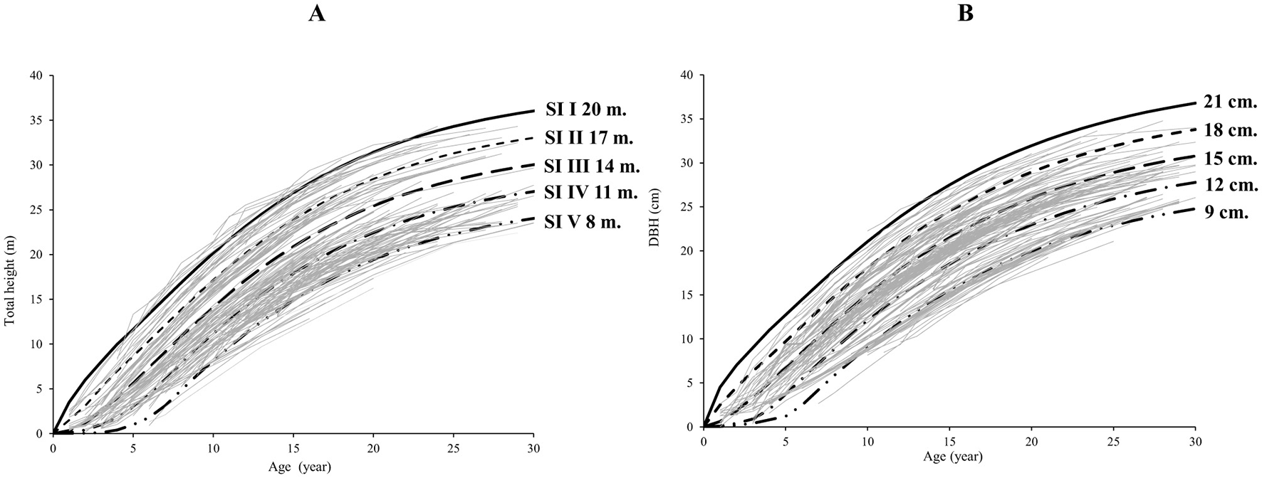 The guide curve method was used to generate SI functions that describe the average pattern of the complete series of H and DBH with age without differentiating between zones in the study area. Polymorphic curves were developed from this curve, and the H and DBH reached at 10 years of age were established as reference values for AG in WLRE (Cañadas, 1983; Shater et al., 2011).