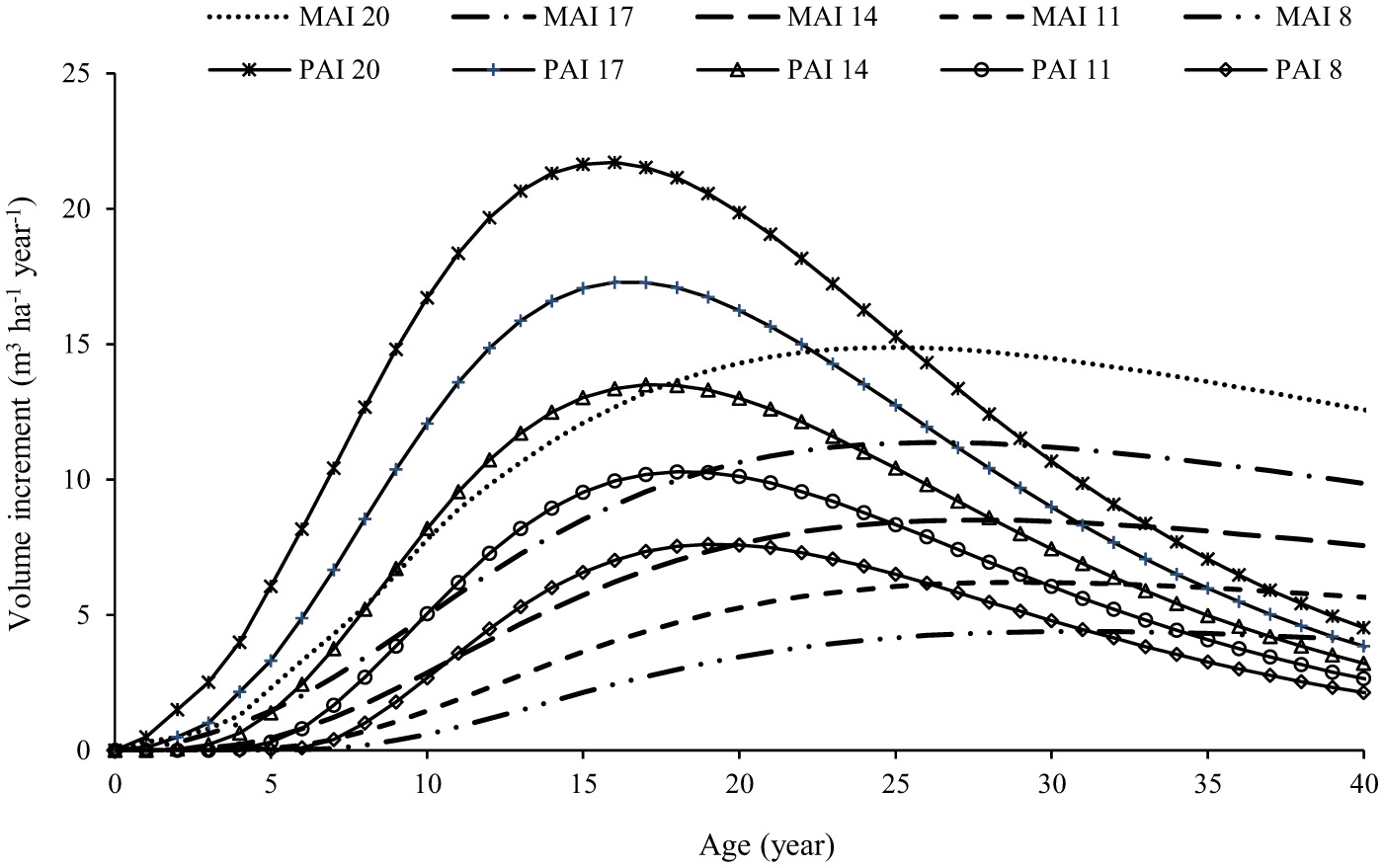 The mean annual increment (MAI) was calculated by dividing the total volume per hectare (Vha), estimated for the rotation age (t), by the rotation age. In other words, the MAI represents the average volume produced per hectare each year during the rotation period.