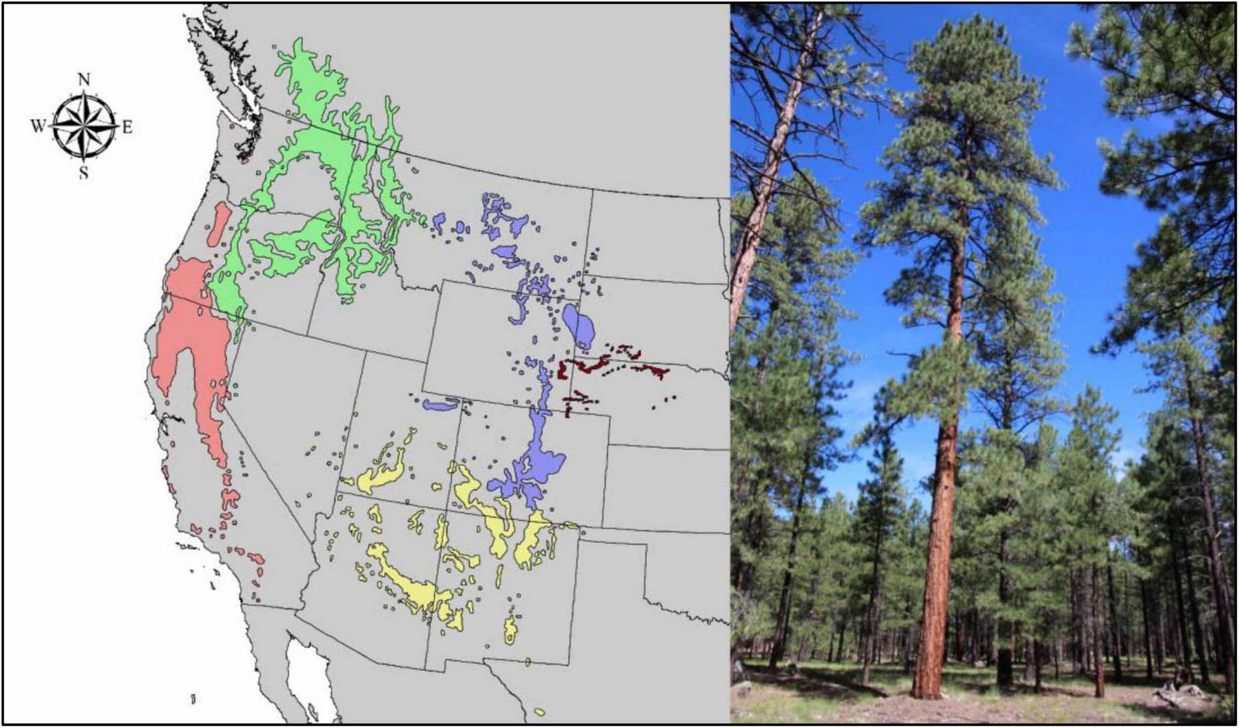 Geographically, P. ponderosa’s native range extends from Canada to Central America (Price et al., 1998). It is naturally distributed in western North America, from British Columbia to California and northern Mexico in the south and east to northwestern Nebraska, covering millions of hectares. The natural distribution of this species includes British Columbia, Arizona, California, Colorado, Idaho, Northeastern Mexico, Northwestern Mexico, Montana, Nebraska, Nevada, New Mexico, North Dakota, Oklahoma, Oregon, South Dakota, Texas, Utah, Washington, and Wyoming (Baker and Korstian, 1931; Meyer, 1938; Little, 1979; Thompson et al., 1999; Kolb et al., 2019).