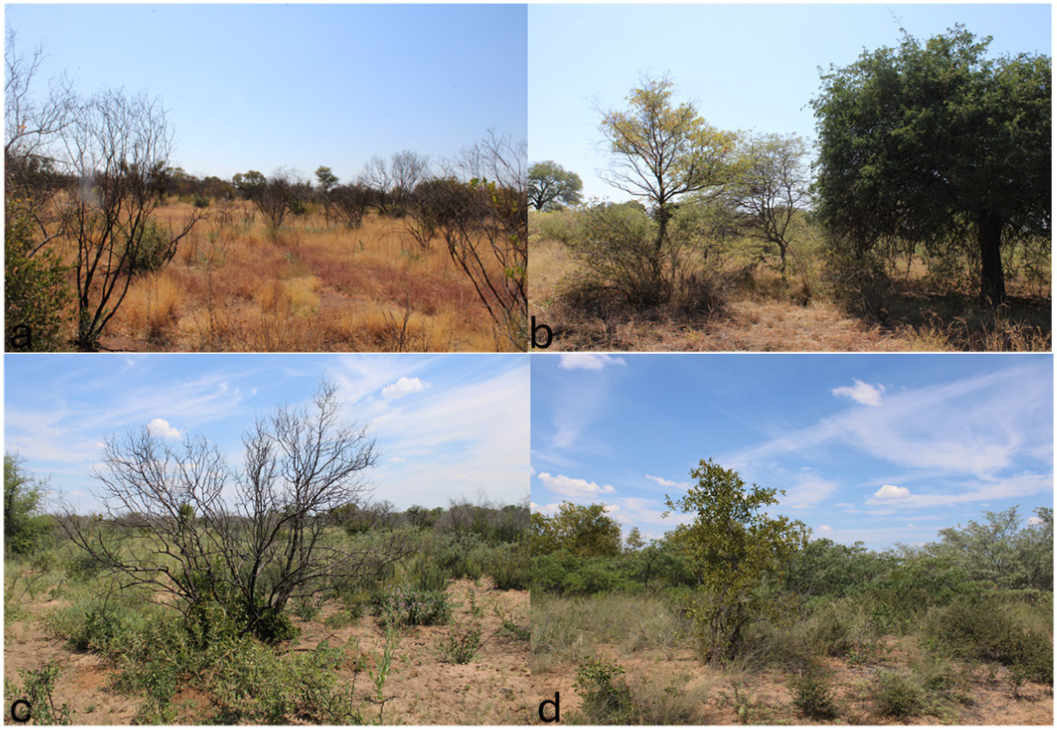 Palapye burned (a) and unburned (b) sites, and Mmashoro burned (c), and unburned (d) sites, and the picture was photographed on the 27 April 2023 (7 months after burning).