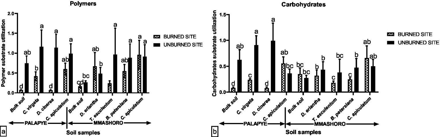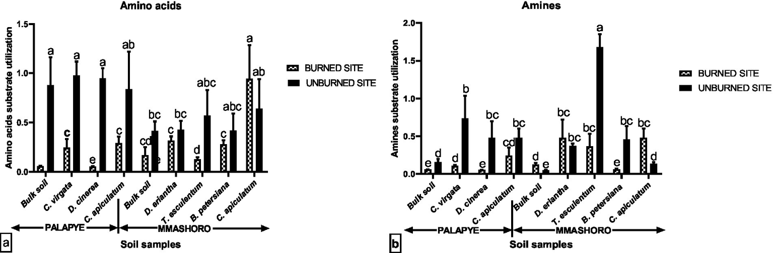 The data of the vegetation diversity and soil chemical properties of the bulk and rhizosphere soil of the dominant plant species from burned and unburned area from Palapye (C. virgata, D. cineria, and C. apiculatum) and Mmashoro (D. eriantha, T. esculentum, B. petersiana, and C. apiculatum) were analyzed using two–way analysis of variance (ANOVA) using Tukey multiple comparison to detect significant difference (p < 0.05). The data of the community level physiological profiling (AWCD), and soil microbial community functional diversity indices (Shannon-Weiner index, Simpson index, and McIntosh Index) of the bulk and rhizosphere soil of C. virgata, D. cineria, and C. apiculatum from Palapye burned and unburned area and D. eriantha, T. esculentum, B. petersiana, and C. apiculatum from Mmashoro burned and unburned area were evaluated using three-way analysis of variance (ANOVA) with Tukey multiple comparison to detect any significant difference (p < 0.05) using SPSS 12. The data was presented as Mean ± standard deviation. The normality of the variances of the data was tested using Shapiro–Wilk test and the p > 0.05 indicating that the data were normally distributed. The carbon substrate utilization pattern was analyzed by Principal Component (PC) and bi-plots of the PCs generated were prepared to elucidate segregation and similarities between samples.