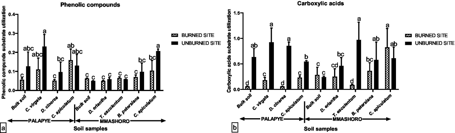 About 86 percent of the land mass of Botswana is covered by the savanna ecosystem which supports the subsistence livelihoods of 80 percent of the population (Woods and Sekhwela, 2003). Between 1820 and 1935, travelers to Botswana described the landscape as grass dominated savanna (Woods and Sekhwela, 2003). This ecosystem contributes substantially to Botswana’s gross domestic product (GDP) through agriculture and tourism, and it also provides forage for domestic and wild animals (de Torres Curth et al., 2012). Savanna ecosystem is highly impacted by various factors, with wildfires standing out as the most influential. Wildfire is a biogeochemical agent that has been an integral component of savanna ecosystems worldwide for over 300 million years, playing a vital role in their creation and maintenance (Bond and Keeley, 2005; Bowman et al., 2009; Ryan and Williams, 2011). Wildfires contribute significantly to soil degradation and the reduction of essential elements through soil erosion and vaporization (Gómez-Rey et al., 2013; Agbeshie et al., 2022). They can disrupt soil physicochemical properties (including texture, pH, electrical conductivity (EC), total organic matter, and nutrients) and biological properties (Jhariya and Raj, 2014; Ghazoul et al., 2015; Silvério et al., 2019; Agbeshie et al., 2022) while also increasing water repellency (Novara et al., 2013). Although wildfire reduces the total organic matter of the soil, some instances were identified in Sicilian grasslands where this has remained constant (Novara et al., 2013). Furthermore, burning organic matter produces a large amount of readily accessible nutrients that can be utilized for plant recuperation (Kauffman et al., 1992; Chungu et al., 2020; Arunrat et al., 2024; Johnson et al., 2024; Hu and Wan, 2024; Ji et al., 2025). Mineral ash produced by burning biomass can also affect soil pH, as well as microbial activities associated with the decomposition of organic matter and recycling of the nutrients (Kauffman et al., 1992; Chungu et al., 2020; Arunrat et al., 2024; Johnson et al., 2024; Hu and Wan, 2024; Ji et al., 2025). Soil microbial communities serve an important function in the breakdown of organic matter within the bulk soil and the rhizosphere through their metabolic processes. The microbes secrete degrading enzymes within the rhizosphere that regulate the decomposition and accumulation of organic matter (Nannipieri et al., 2003). The rhizosphere serves as the epicenter for microbial metabolism and activity which contribute a significant role in the maintenance of carbon and nutrient recycling within the terrestrial ecosystem (Turpault et al., 2007; Kuzyakov and Blagodatskaya, 2015; Zhao et al., 2022). The rhizosphere differs from bulk soil due to various biological, chemical, and physical processes driven by root growth, nutrients, water uptake, respiration, rhizo-deposition, and increased microbial growth (Yadav and Islam, 2023). Soil microorganisms form complex communities that drive 80–90% of soil processes and these includes decomposition, mineralization, and immobilization that are imperative for recycling nutrients and degrading pollutant in the environment (Nannipieri et al., 2003). Microorganisms respond rapidly to environmental changes, and shifts in their biomass, metabolic processes, or community composition can serve as early indicators of positive or negative changes in the entire ecosystem (Barreiro et al., 2015). Wildfires significantly alter the carbon source consumption profile of microbial communities within the rhizosphere, reducing the diversity and efficiency of carbon metabolism (Mubyana-John et al., 2007; Aponte et al., 2022).