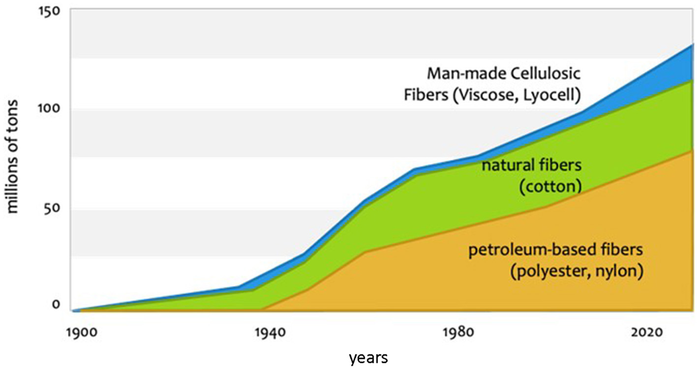 Global textile production for major fibers over the last century shows the dominance of cotton and polyester, while man-made cellulosic fibers are experiencing significant growth as well.