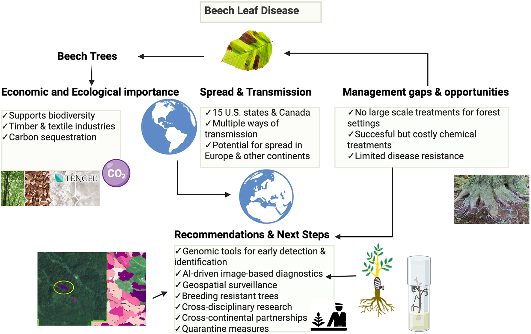 Beech leaf disease: threats, transmission and strategic responses. Created with biorender.com.